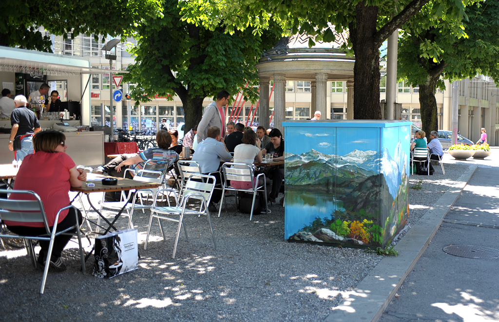 这位前电影幕布画师,为伯尔尼水利能源公司(EWB)的10个位于市中心的变压器箱“换上了新装”。这些画上的景观将至少保留到8月中旬,如果深受欢迎,还会考虑延长展期。