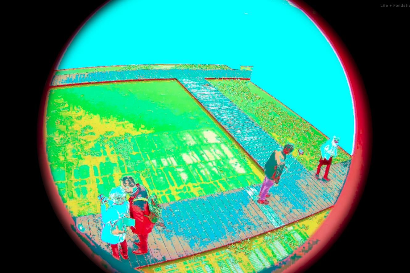 2021年5月19日,5点30分:4周后我再一次拜访了《生命》展。这次我选择的是凌晨用电脑“参观”。我打开伴随整个展览的直播外部链接,点击设置在花园和展厅的摄像头图标。镜头被加上了不同滤镜,以模拟其他物种的视觉成像。如万花筒般裂开的镜头模仿的是苍蝇的复眼;红外线成像则是为了模拟蝙蝠的视觉。