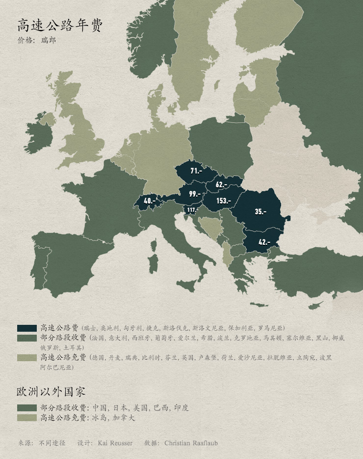 同其他欧洲国家相比,瑞士提出的100瑞郎的新高速公路收费标准处于中等水平,同奥地利的收费水平相近。而在法国、意大利和西班牙等国家,公路费和行使的公里数相挂钩,开车族所缴纳的高速公路费也相对“高昂”很多。