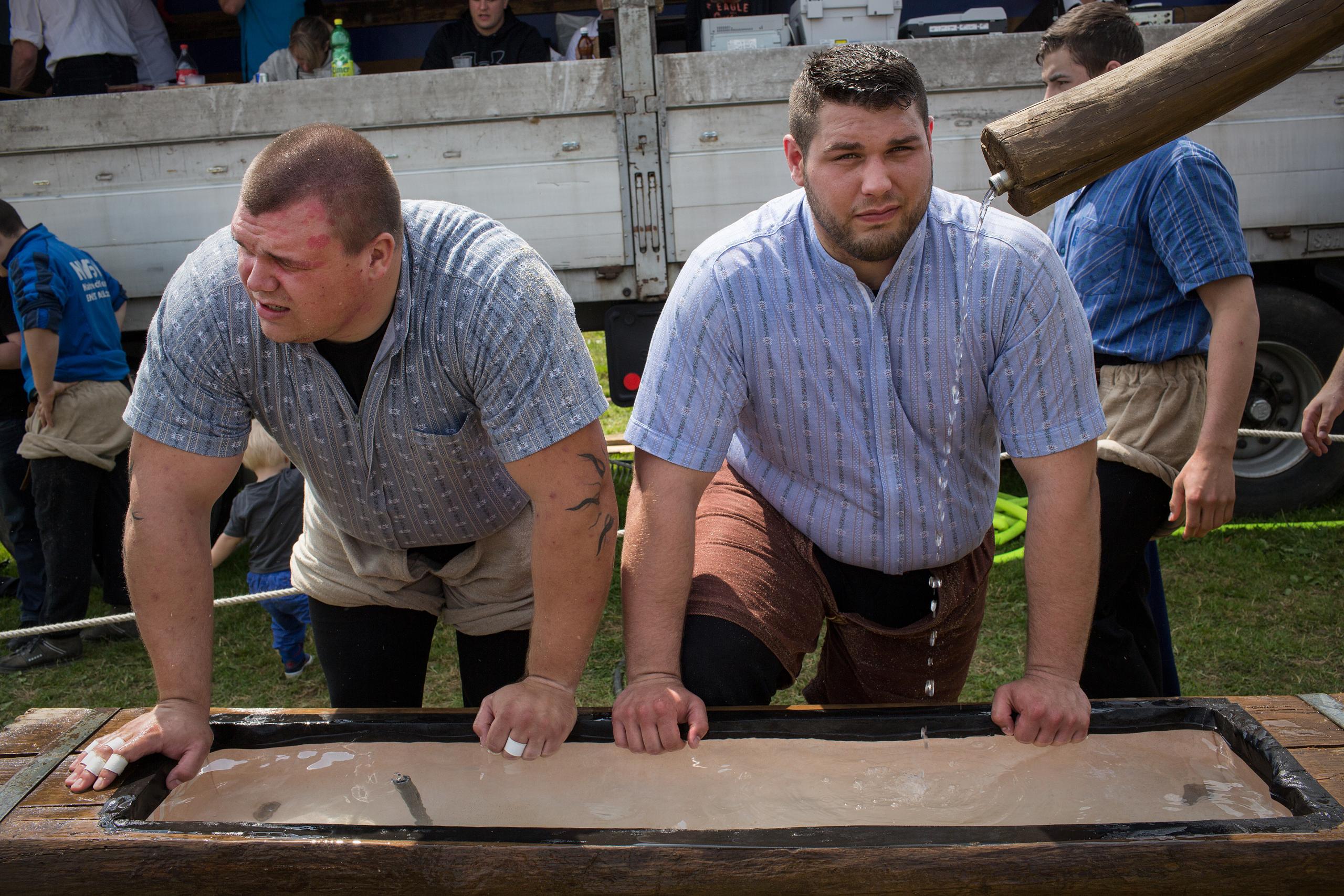 这位23岁的大力士身高1.90米, 体重280斤,说着一口瑞士德语,而且对这项民间运动的传统十分尊仰。刚刚赢了一场比赛的他,帮对手掸了掸肩膀的木屑,又去马槽冲了把脸。在比赛场上,人人平等。胜负只取决于力量和技术。