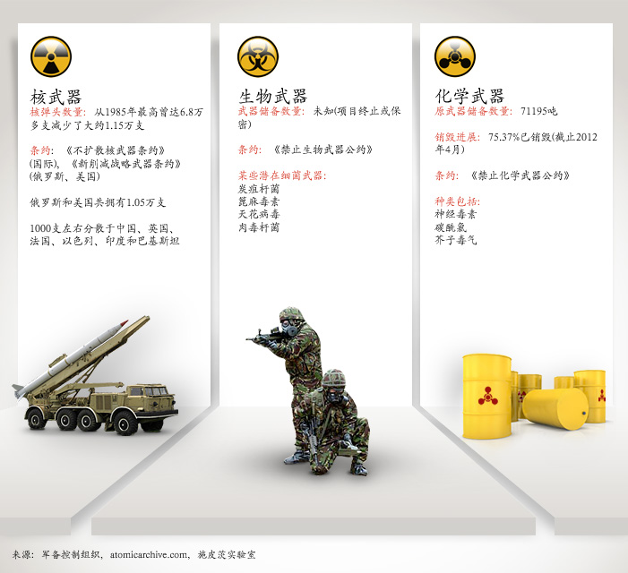 虽经多年谈判,所谓的大规模毁灭性武器仍在被贮存。尽管核武器数量已下降,化学毒剂被销毁,生物武器却仍是未知的危险。