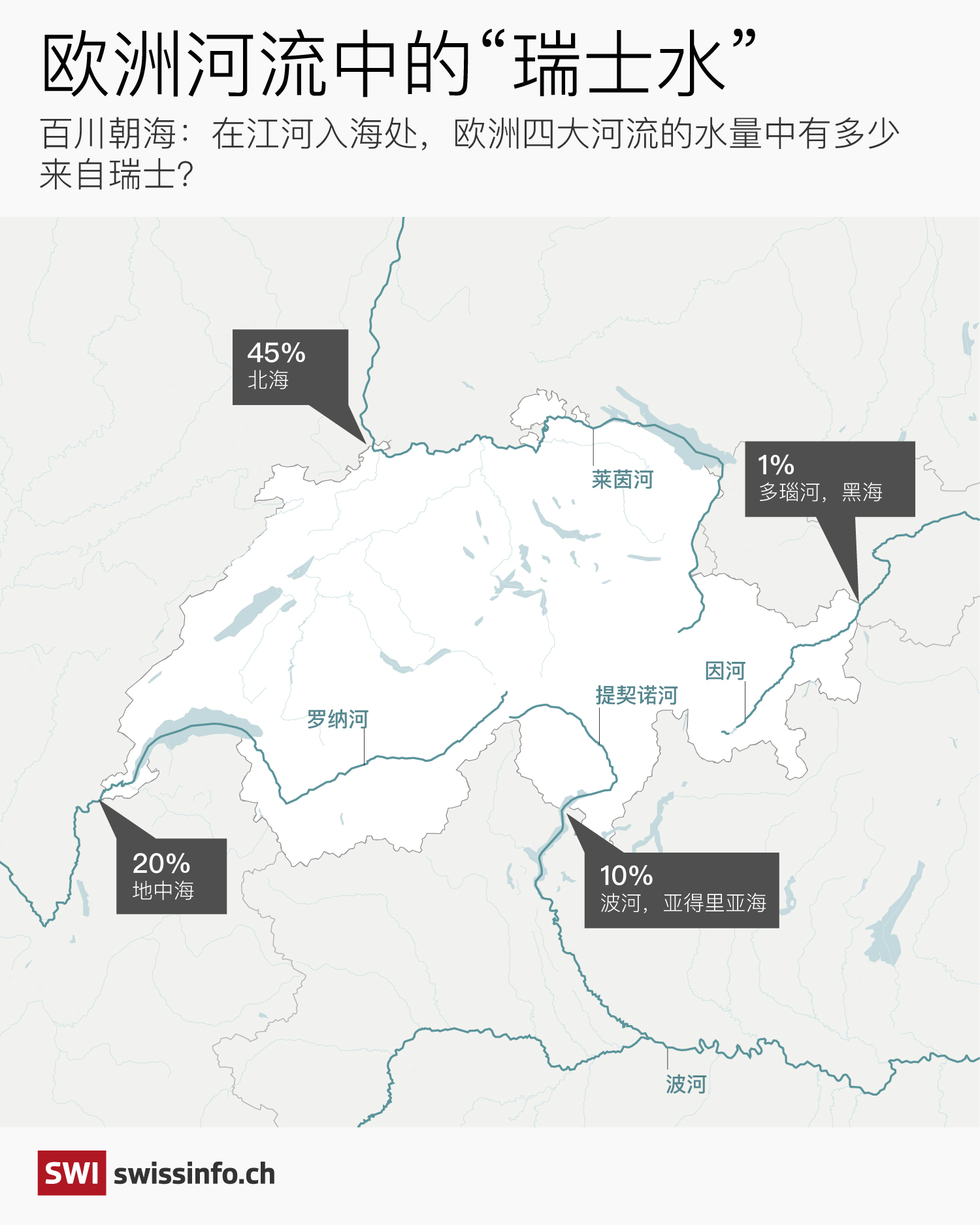 瑞士水源對歐洲主要河流的最終流量貢獻取決於阿爾卑斯山的降水量和冰雪融化強度。根據瑞士聯邦環境局(FOEN)的數據,關於瑞士水源的年均流量占比,因河約為1%,波河為10%,隆河為20%,萊茵河為45%。