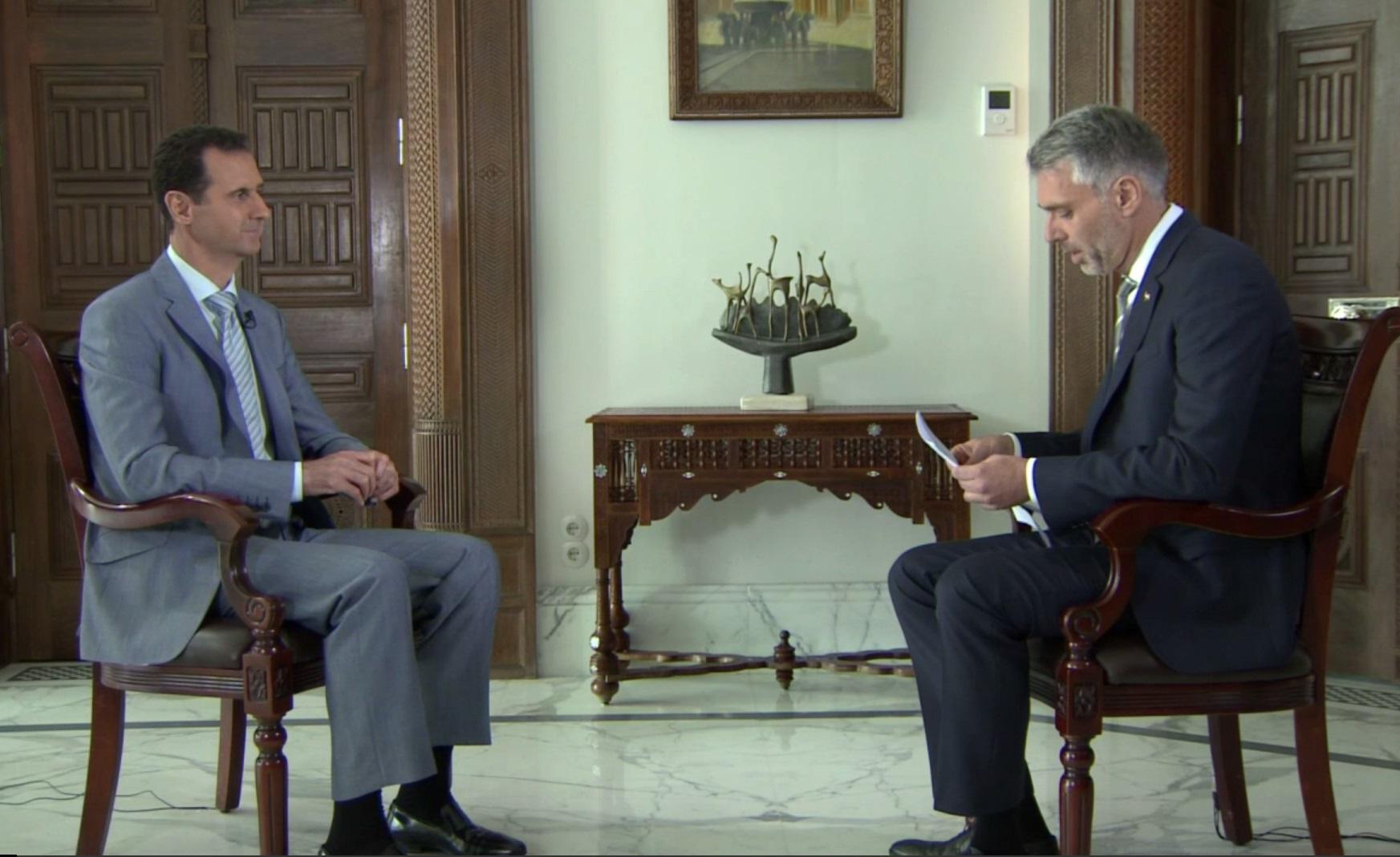 在长达20分钟的电视采访中,阿萨德表示,对他个人而言,他在叙利亚内战中所扮演的角色很明晰:由他掌舵的政府及“叙利亚盟友”俄罗斯、伊朗和中国,是在携手保卫叙利亚、捍卫国土,“以免叙利亚被那些心怀叵测、借恐怖分子为替身的某些国家的最终入侵”。