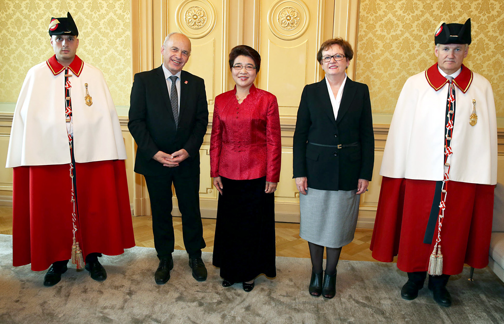 许大使:作为中国驻瑞士第一位女大使,我感到荣幸和自豪。新中国成立以来已任命了几十位女大使。她们在外交工作中兢兢业业,恪尽职守,充分展现了当代中国女外交官的职业素质和风采。出任驻瑞士大使是我第三次手执国书,出使一方。我对完成好自己的使命充满信心。