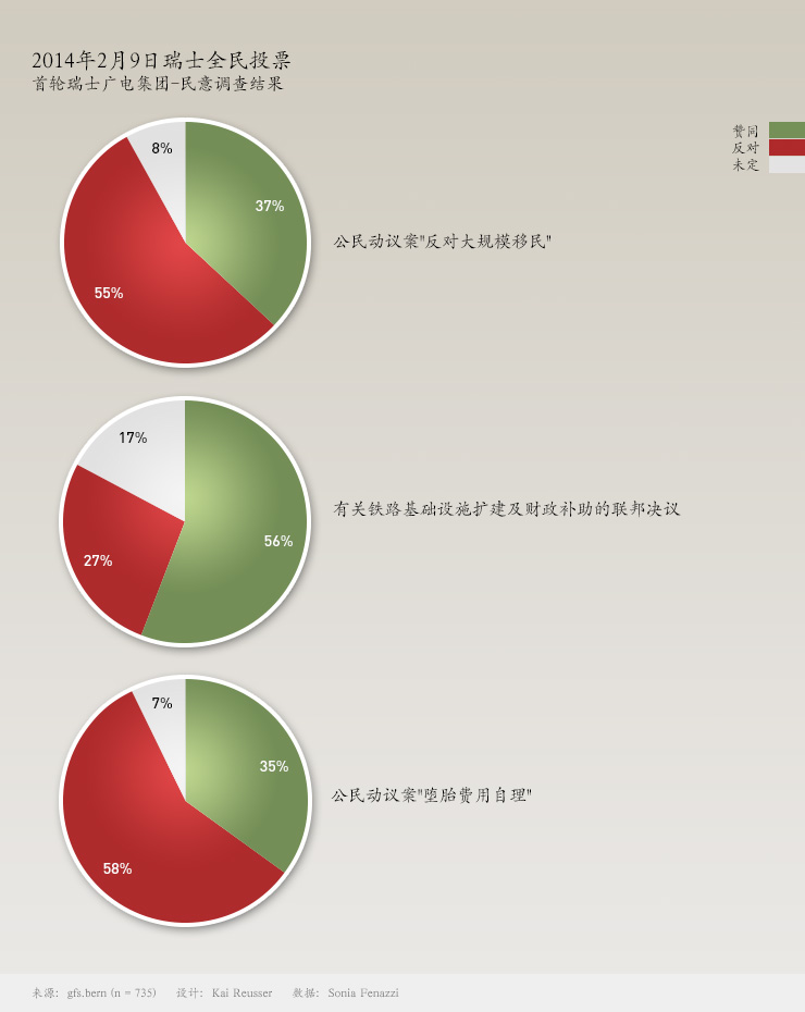 瑞士政治 首轮瑞士广电集团-民意调查结果 swissinfo.ch 受瑞士广电集团委托,民调研究所gfs.bern公布了针对将于2014年2月9日进行投票的三项议题的第一次普调结果。 此内容发布于 2014年01月14日 - 09:36 1 分钟 自2013年12月23日-2014年1月5日之间,共有来自瑞士各地、各语言区的1207位选民,接受了抽样调查。 阅读最长 讨论最多 符合JTI标准 相关内容: 瑞士资讯SWI swissinfo.ch得到新闻信任计划的认证 您可以在这里找到读者与我们记者团队正在讨论交流的话题。 请加入我们!如果您想就本文涉及的话题展开新的讨论,或者想向我们反映您发现的事实错误,请发邮件给我们:chinese@swissinfo.ch。