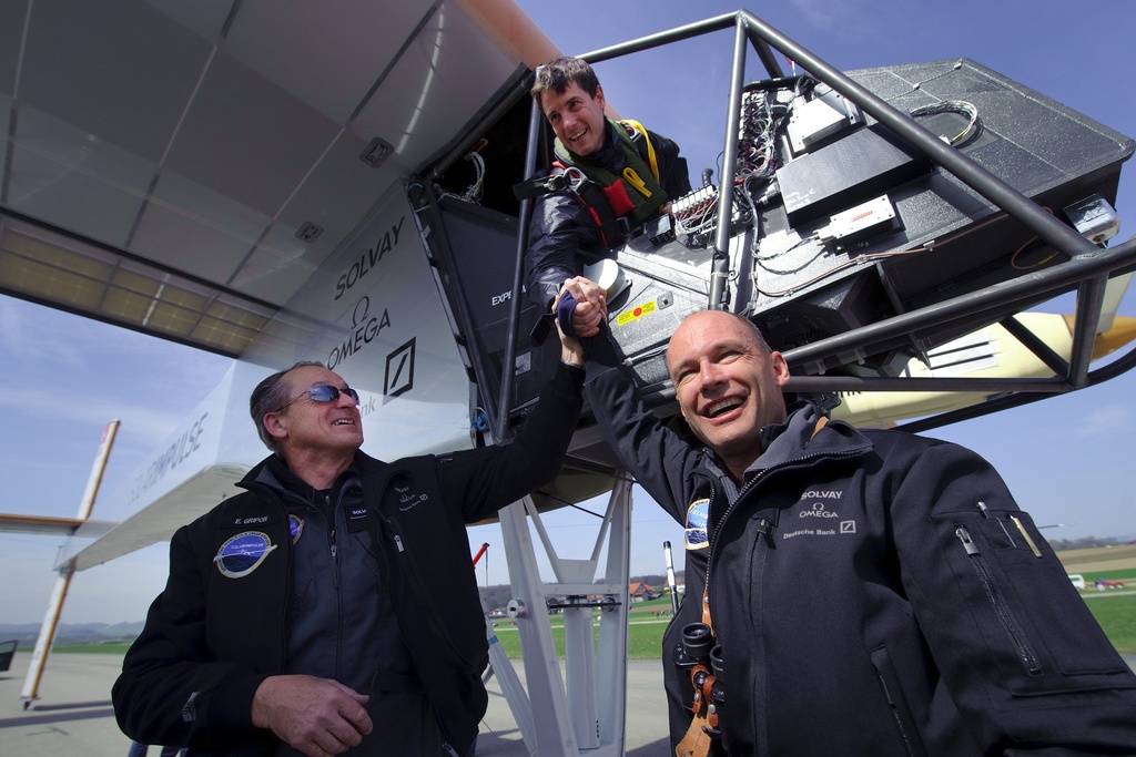 从左向右,Solar Impulse号太阳能飞机总裁André Boschberg,试飞飞行员Markus Scherdel和伯特兰·皮卡德在Payerne机场 Keystone