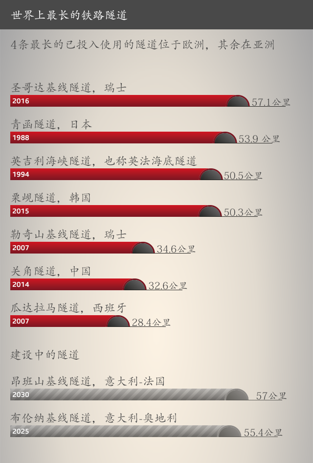 这条新隧道将成为阿尔卑斯山脉最重要的交通线路之一,是世界上最长的隧道:57公里,但是并不是唯一一条长度令人惊叹的隧道。