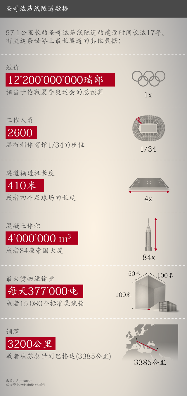 圣哥达基线隧道与2012年伦敦奥运会有什么关系?又与纽约标志性建筑帝国大厦有什么相关?瑞士资讯swissinfo.ch在这条世界上最长隧道开通前一个月告诉您关于它的一些数据。