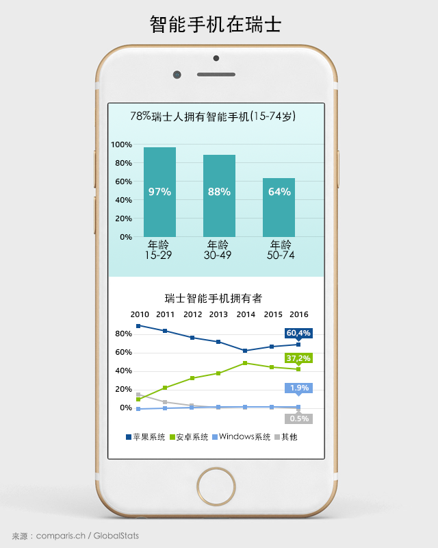 苹果公司没有提供按国家列出的iPhone销售数据。但是comparis.ch对瑞士人都用哪种手机做了调研。在iPhone与iOS操作系统的世界里,瑞士占据着最大市场份额之一。