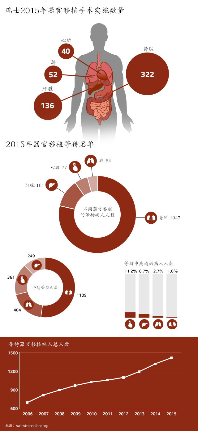 支持器官捐献的组织Swisstransplant透露,截至2016年9月底,列在器官捐献等候名单上的瑞士居民人数已近1498人。这是2010年以来的峰值。
