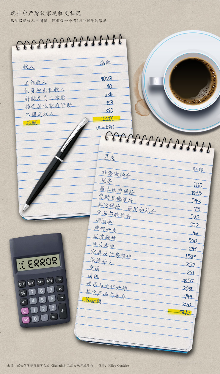 当然,在你查阅瑞士各行业工资明细时,可千万别忘了:这里的生活成本可是位居世界第一。下方图表中的预算,为您呈现了一幅典型的瑞士中产阶级家庭罗列的每月家庭开销明细。