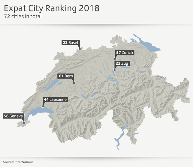 旅外人士交流平台暨调查机构“国家之间”(InterNations)基于自己的年度《旅外人士内情调查》(Expat Insider survey,英)外部链接,于本周二(11月20日)公布了《2018年旅外人士城市排名》(Expat City Ranking 2018)。在他们分析的全世界72个城市当中,就包括上述6个瑞士城市。