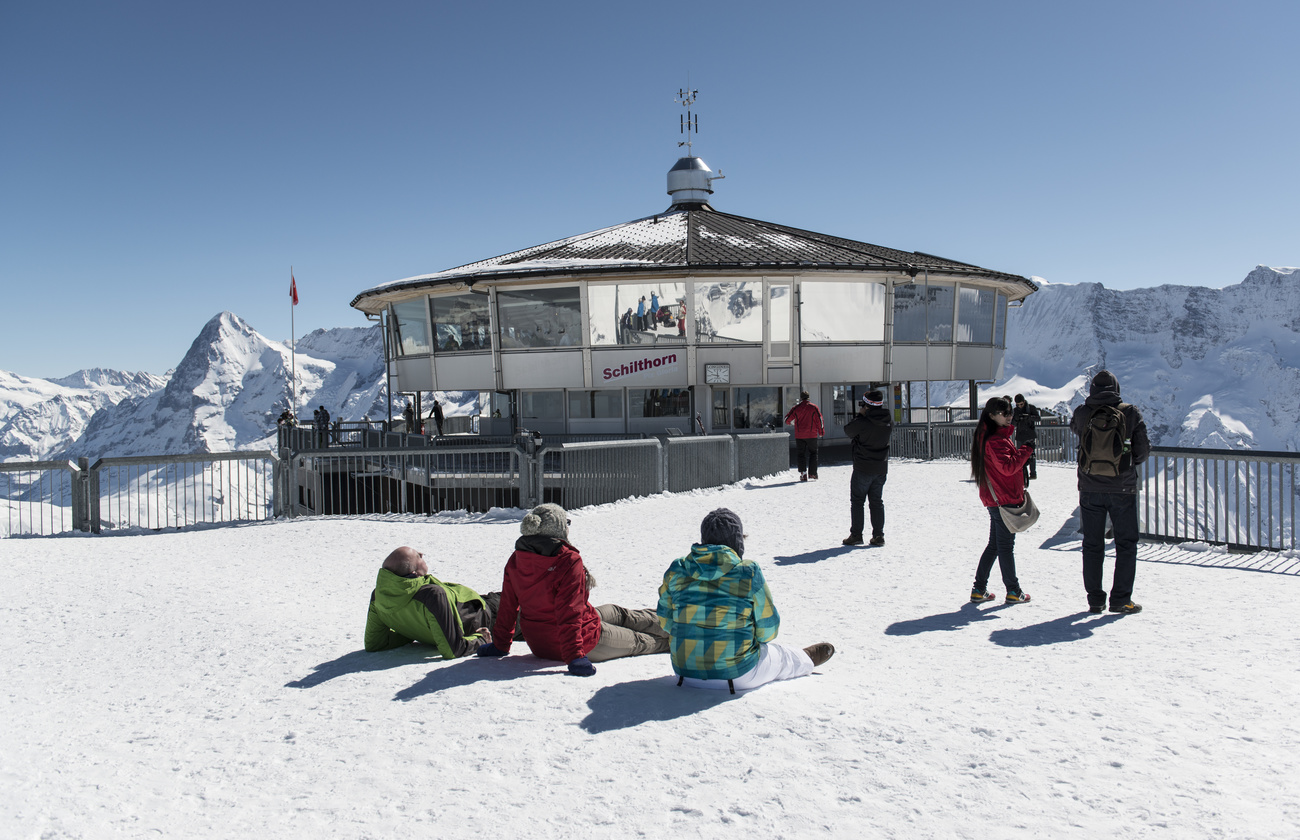 隨著纜車戛然而止,我們肩扛滑雪板,步入皮茲格洛麗亞(Piz Gloria)餐廳。1969年冬天,這個圓錐形的度假場所聚集了眾多龐德女郎,其中包括喬安娜·魯姆莉(Joanna Lumley)和戴安娜·里格(Diana Rigg)。整個度假區遍布山區風格的別緻裝飾,金色隔板環繞式排布,將整個空間分隔開來。令人欣喜的是,那些金色隔板還在,其餘部分則被改建成了一家餐廳,每45分鐘就會旋轉一圈,遊客能夠欣賞阿爾卑斯山最引人入勝的全景風貌。