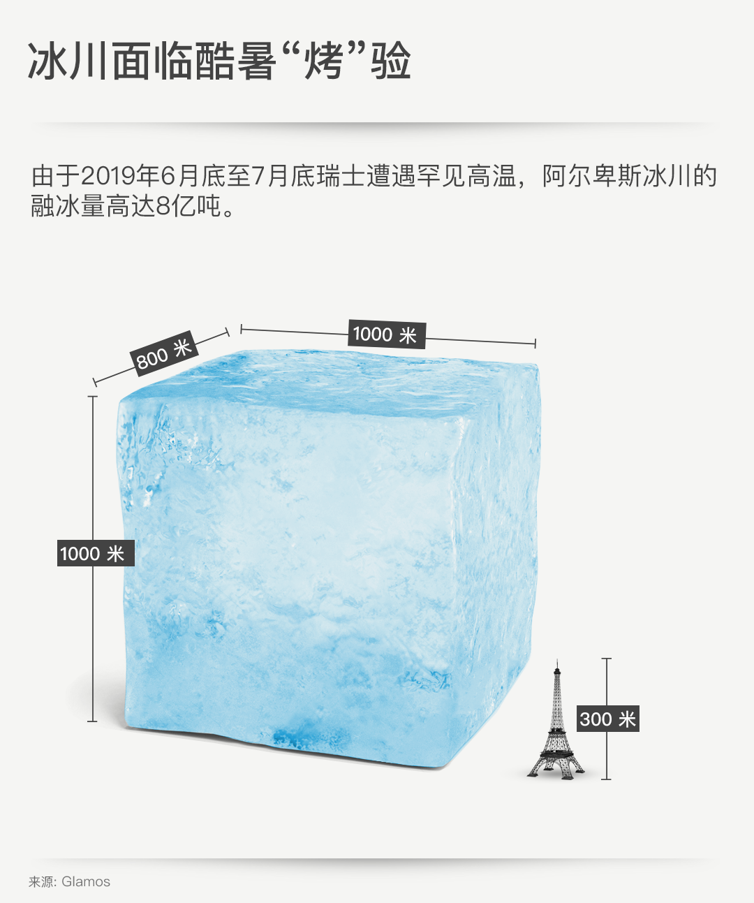 在短短的14个酷暑天里,阿尔卑斯冰川损失了约8亿吨雪和冰。瑞士冰川监测网络(Glamos 多语外部链接)主任马蒂亚斯·胡斯(Matthias Huss 英)外部链接在推特中如此写道: 这足够堆出三个同巴黎埃菲尔铁塔体积相同的冰塔,相当于瑞士人口(850万)一年的饮用水量。
