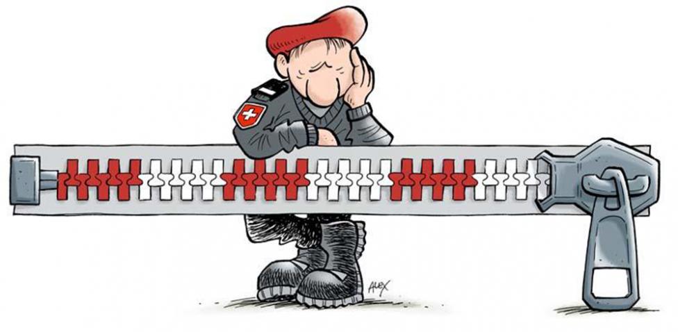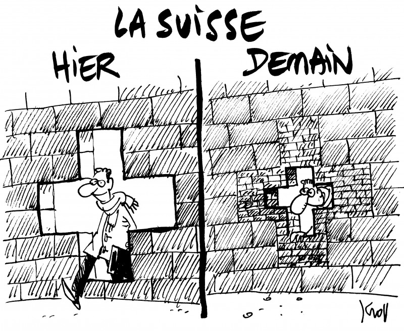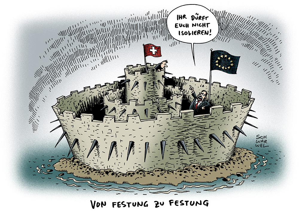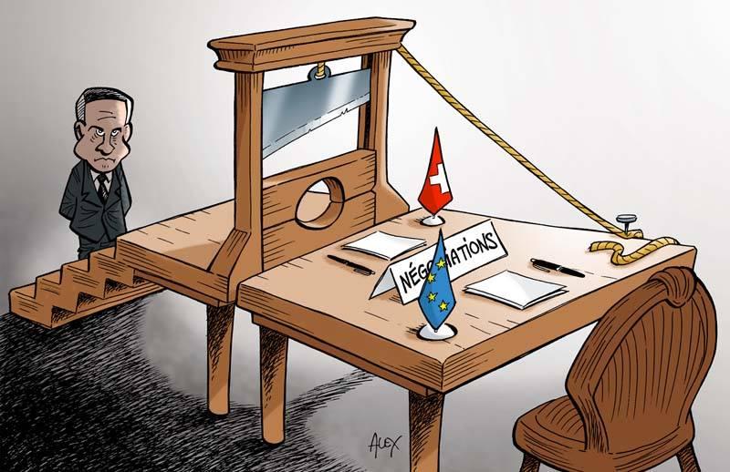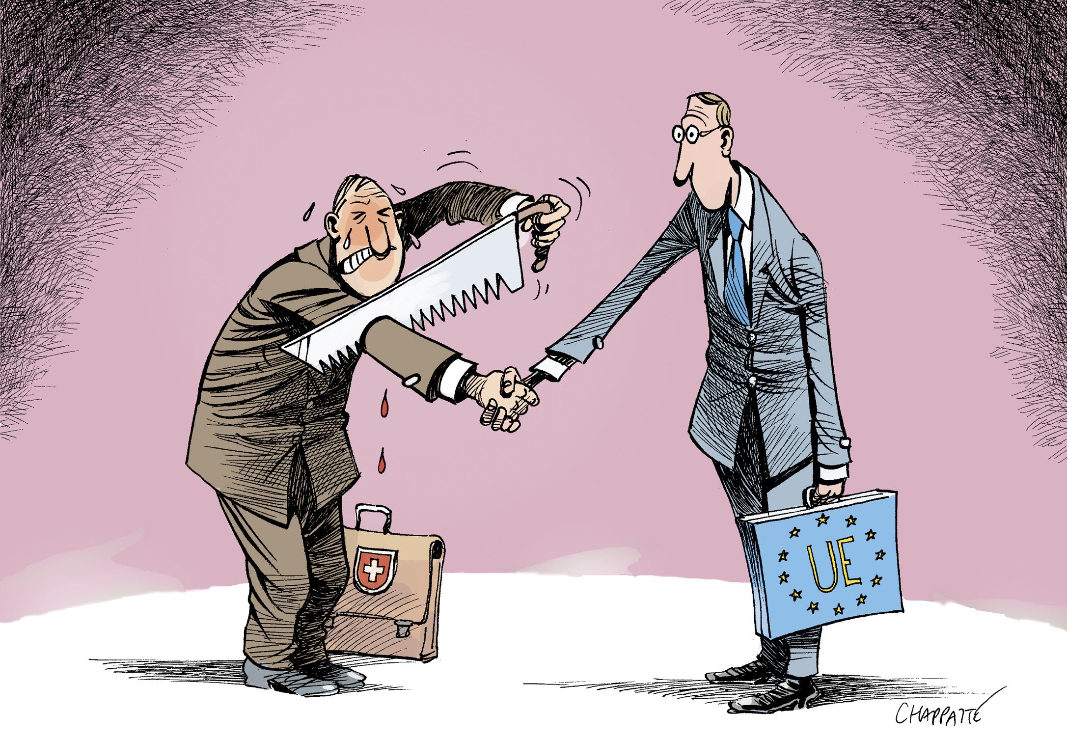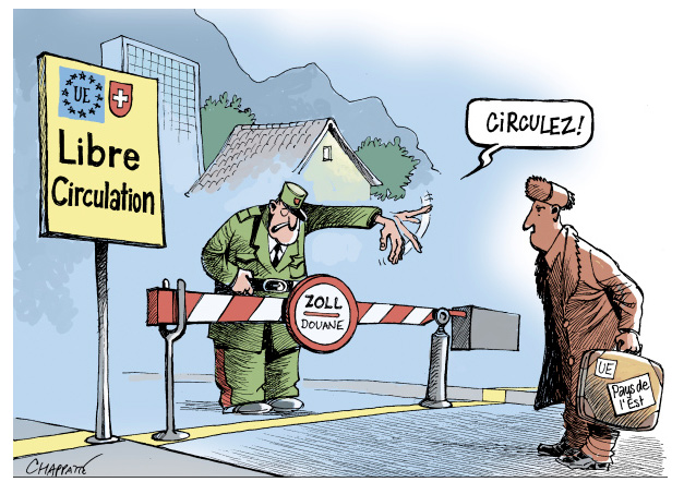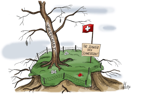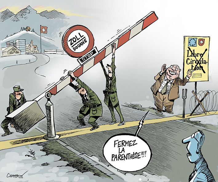 2014年2月9日,瑞士选民以50.3%的微弱多数票反对大规模移民,对于那些擅于以政治为题的漫画家来说,瑞士是把球射进了自家的球门,令瑞士更加不受欢迎,但欧盟的日子也不好过。