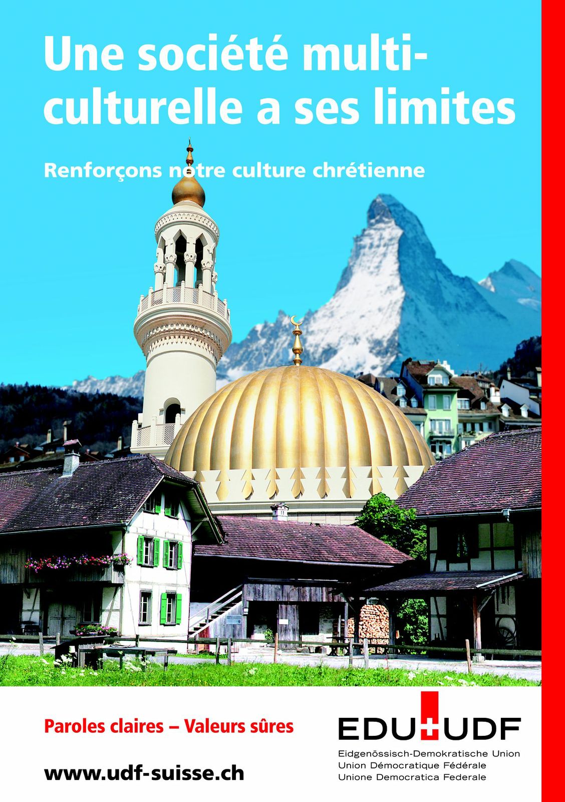“如果村子里不再有教堂,取而代之的是清真寺?”2009年,这张拼图照片用于支持“反对修建伊斯兰尖塔”动议。(Unione democratica federale)