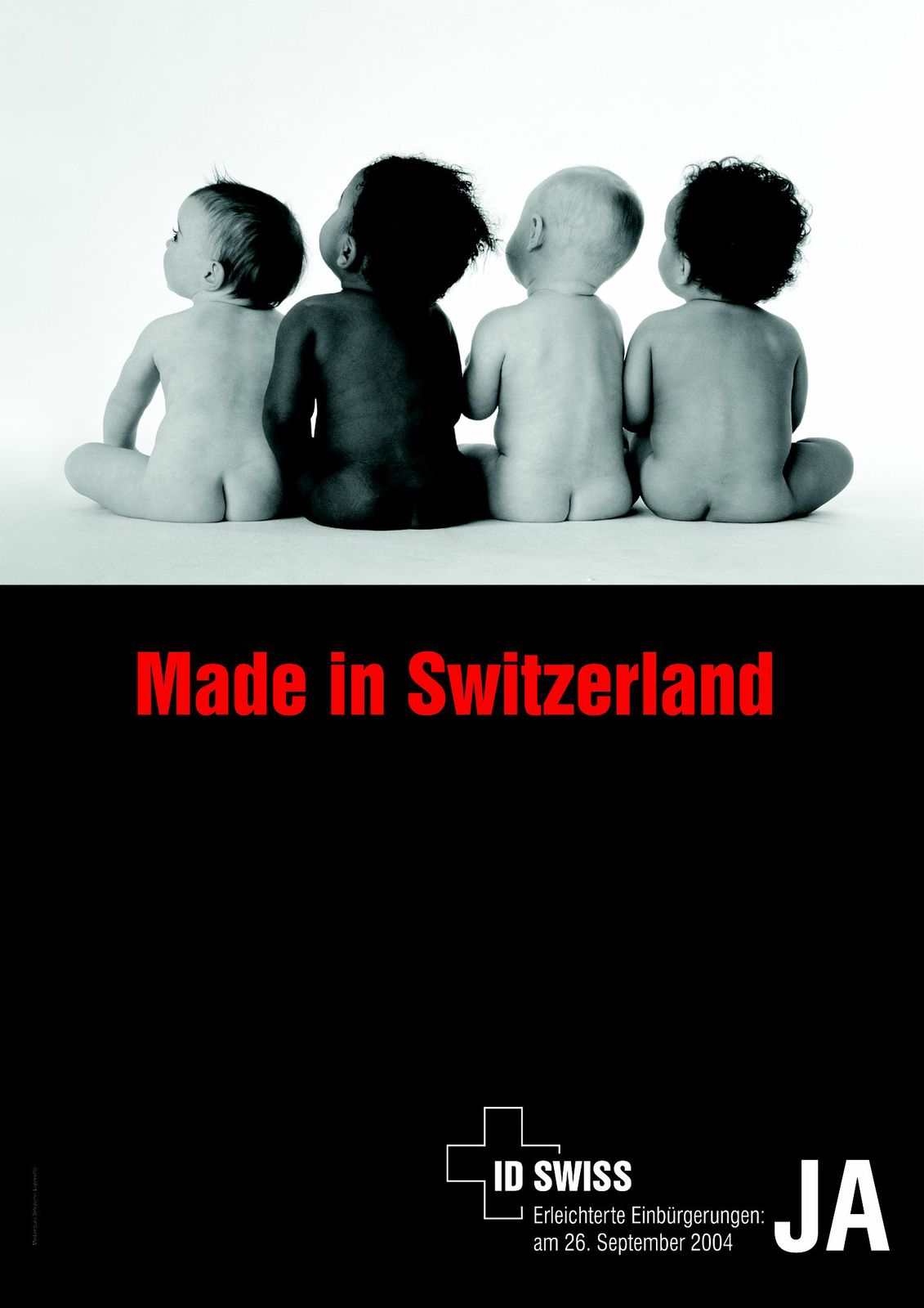 与Toscani为贝纳通所做的广告类似,只不过瑞士工会联合会用此图为2004年要求“简化第二、三代移民入籍手续”的动议造势。(Unione sindacale svizzera)