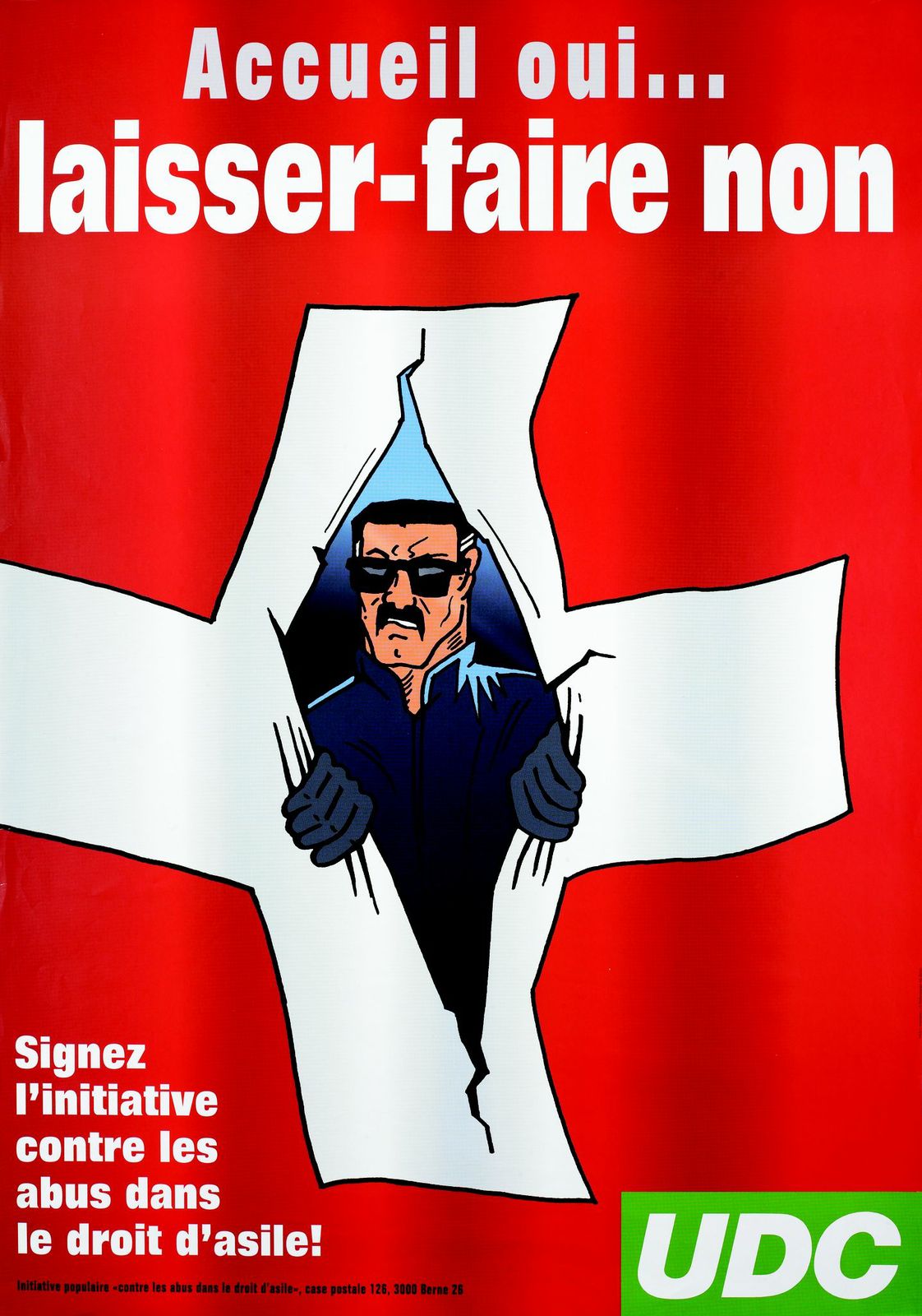 30年后,瑞士右翼人民党使用类似的画面语言反对移民法。外国人的形象看起来来自巴尔干,正撕开瑞士国旗。该倡议于2002年获得失败。(Geneva BGE)