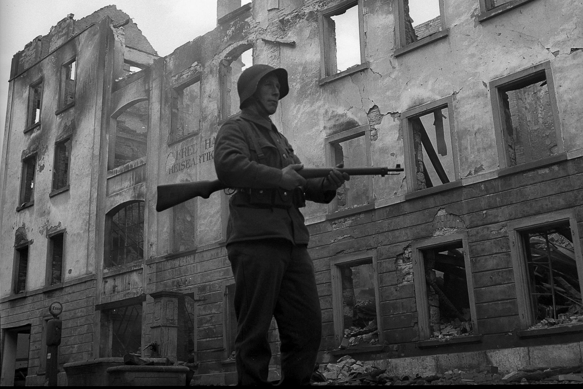 Only the chimney remains in this house in the industrial district in Schaffhausen after the bombing. The air-raid left behind a "horrible mess" according to an air-raid commander. There were people whose heads had been blown off and whose spine was sticking out of their collar. This made him unbelievably angry at the pilots. (Walter Scheiwiller, Milou Steiner, Eugen Suter / Keystone)