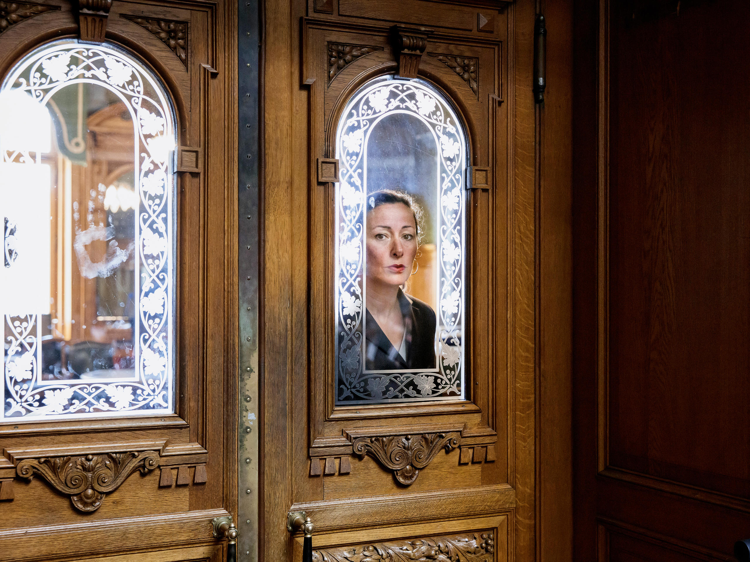 Eine Frau guckt durch die Scheibe einer Tür