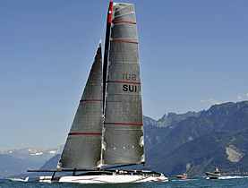 Alinghi 5 has been sailing on Lake Geneva since the beginning of the week and was presented to the media before its transport by helicopter to the Mediterranean at the beginning of August.