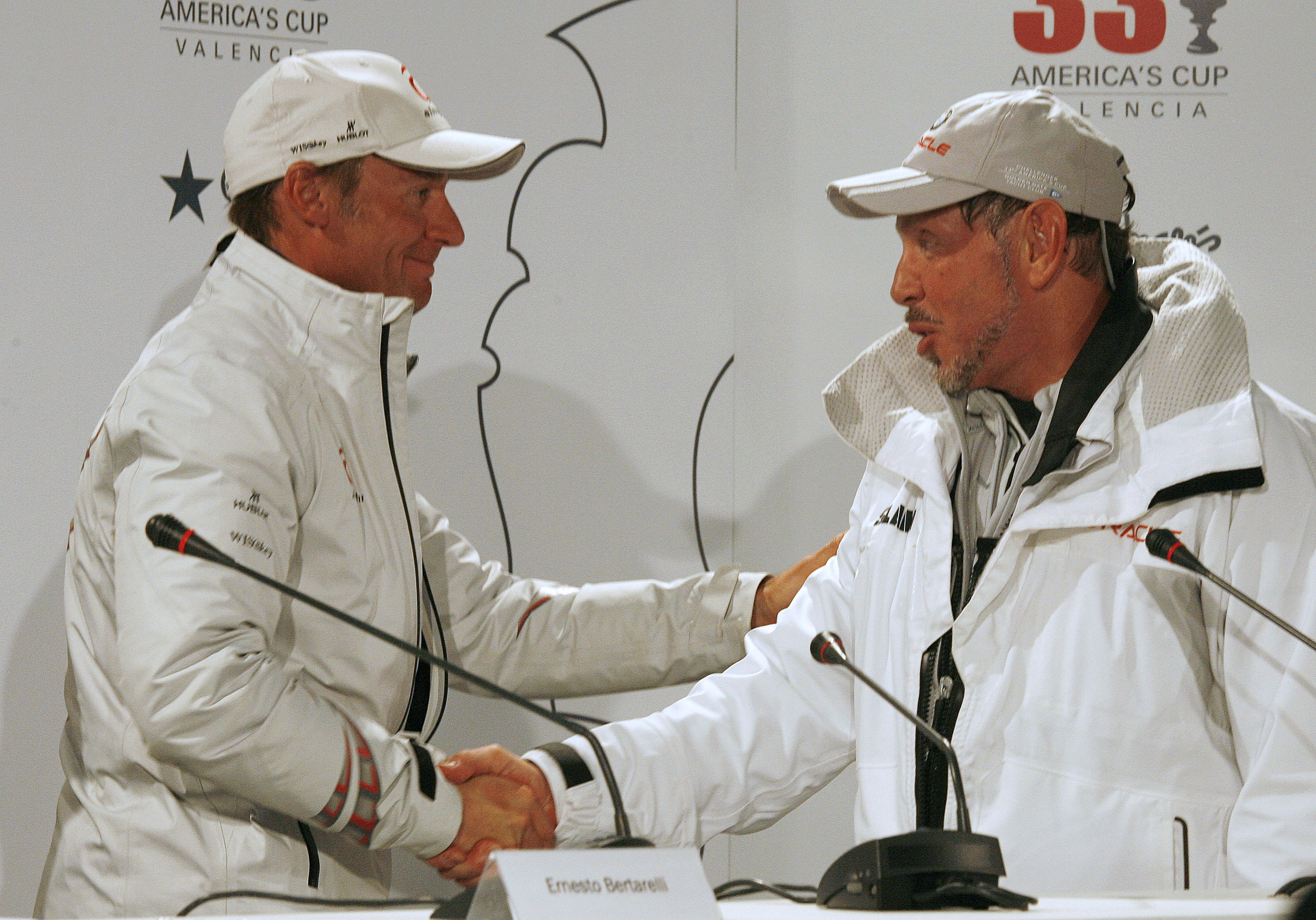 Zurich’s Tages Anzeiger ran a photo on its front page of Bertarelli forcing a smile and congratulating Ellison immediately after the race, captioning it as an “historic handshake”. The previous Monday, Ellison had refused to stand on the same stage as his Swiss rival, and the Swiss billionaire wasn’t at the handover ceremony.