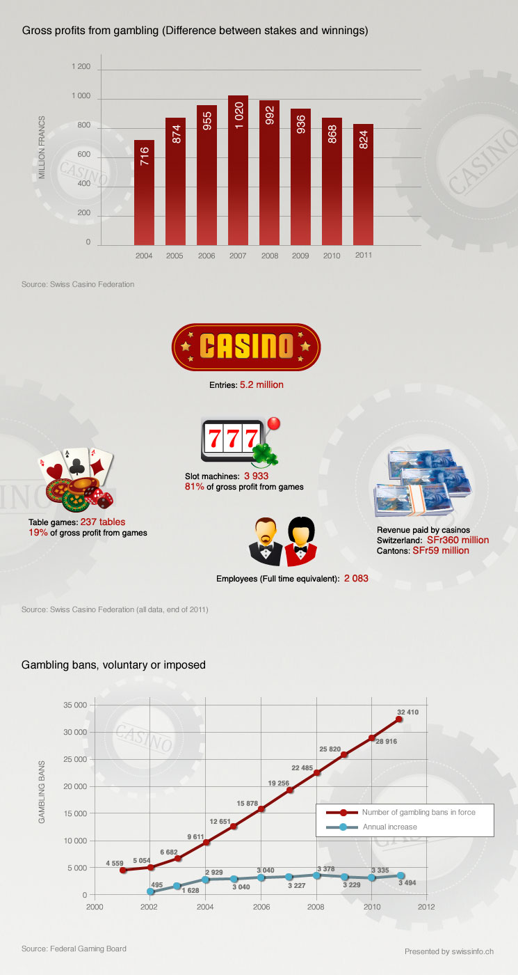Gambling is both popular and lucrative in Switzerland, with a gross profit of SFr824 million in 2011. Money raised benefits the cantons as well as social, cultural, research and sports projects.