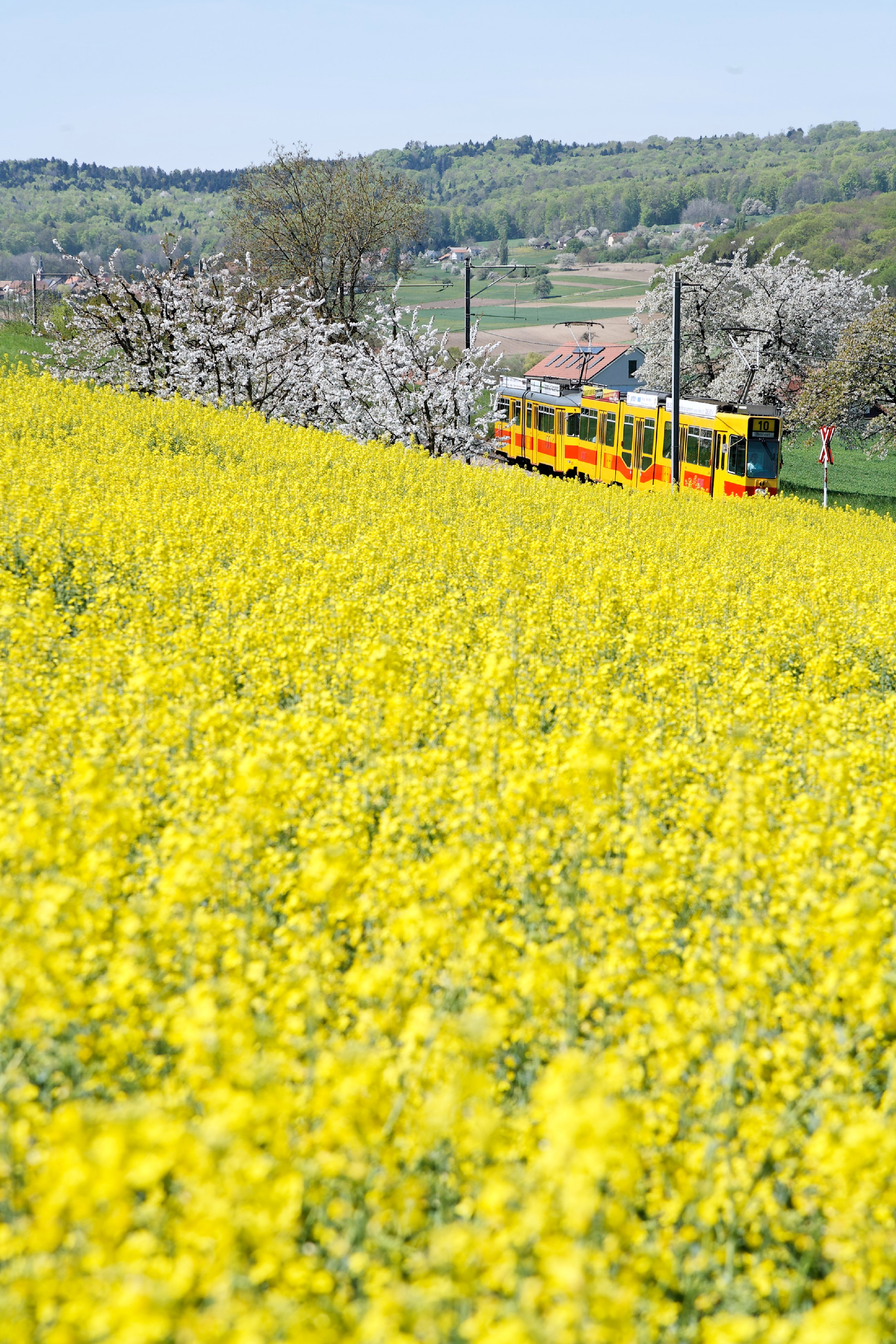 The yellow and red tram number travels from the countryside through the city and back into the countryside. It carries about 17 million passengers a year.