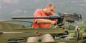 Nick Komornicki, a weapons expert in the British film crew, has been hard at work mounting a machine gun on one of the trucks stationed at the local airfield.