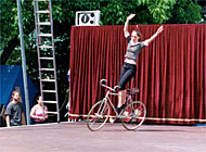 Some performers are warming up for their juggling, trapeze or cycling numbers while others are helping to set up another show. The "troupers" here can be just 15-years-old and have as many as nine years' experience behind them.