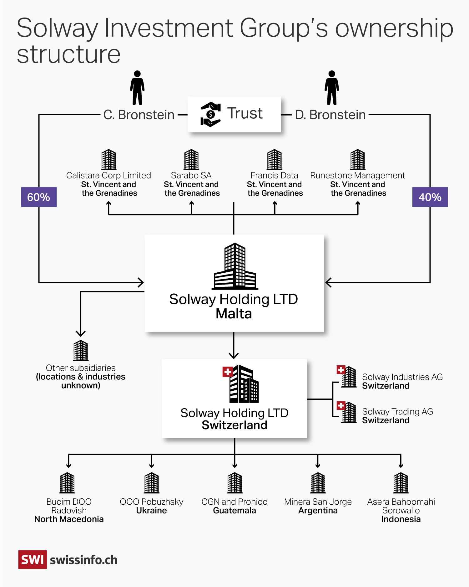 A little over a week before publication of this article, Solway’s legal team shared an extract from the Malta registry with SWI, showing that the sons, Christian and Dan Bronstein, are the beneficial owners with 60% and 40% of the shares, respectively. The company didn’t grant SWI permission to publish the document in light of a EU court ruling restricting public access. A company press officer said that they consider “publication of a document with the personal data of shareholders potentially unsafe, both personally for business owners and their families and for the business itself.”