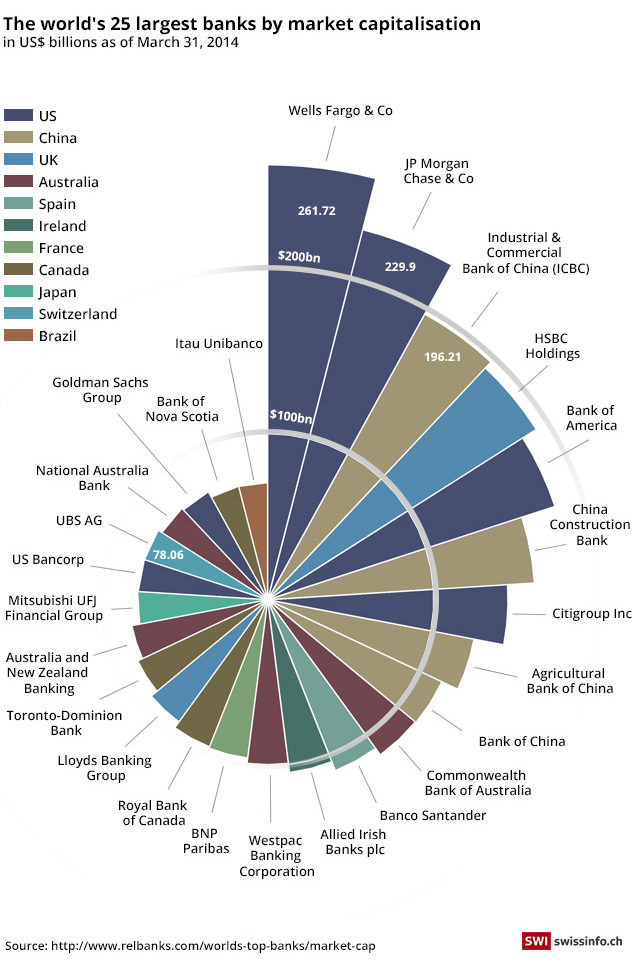 Individual Swiss banks are no heavyweights when measured by market capitalisation, ranking “only” 21st and 35th (UBS $78 billion and Credit Suisse $51 billion) by global comparison. Switzerland’s insurance companies carry slight more weight in the worldwide ranking, with Zurich $39 billion (CHF36 billion) and Swiss Re $23 billion occupying 7th and 17th places respectively. By comparison, at the end of 2013 Apple had a market capitalisation of $415.7 billion, while flagship Swiss companies Roche and Nestlé were capitalised by up to $202 and $234 billion respectively.