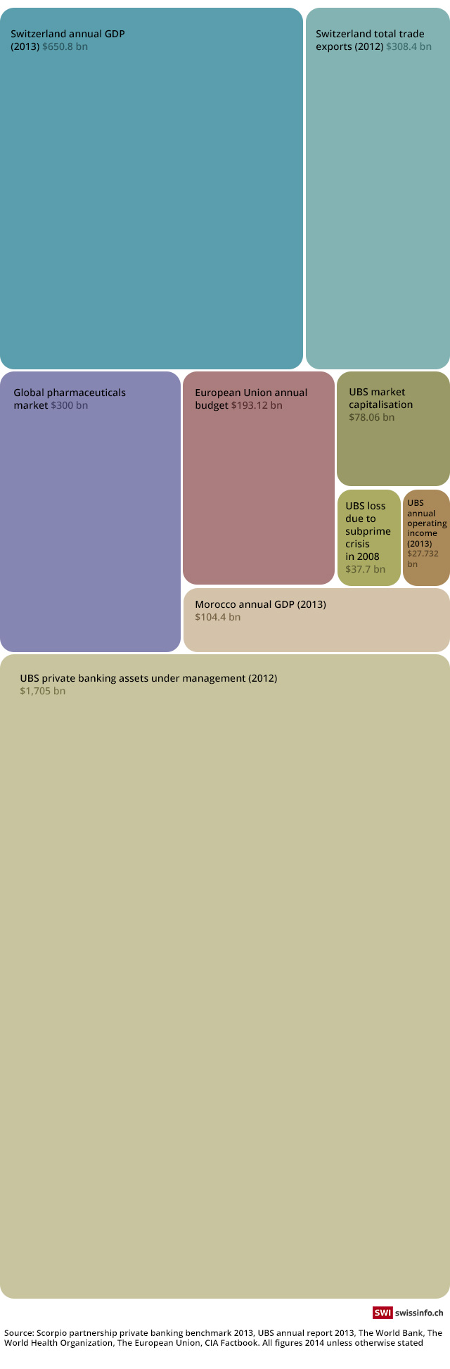 In the international ranking of private banking by assets under management, Switzerland has six private banks in the top 20. In 2013, UBS was the world’s top private banker, managing more than $1.7 trillion for high-net-worth individuals. It is hard to imagine a figure of over a trillion dollars, so this chart puts it into perspective: