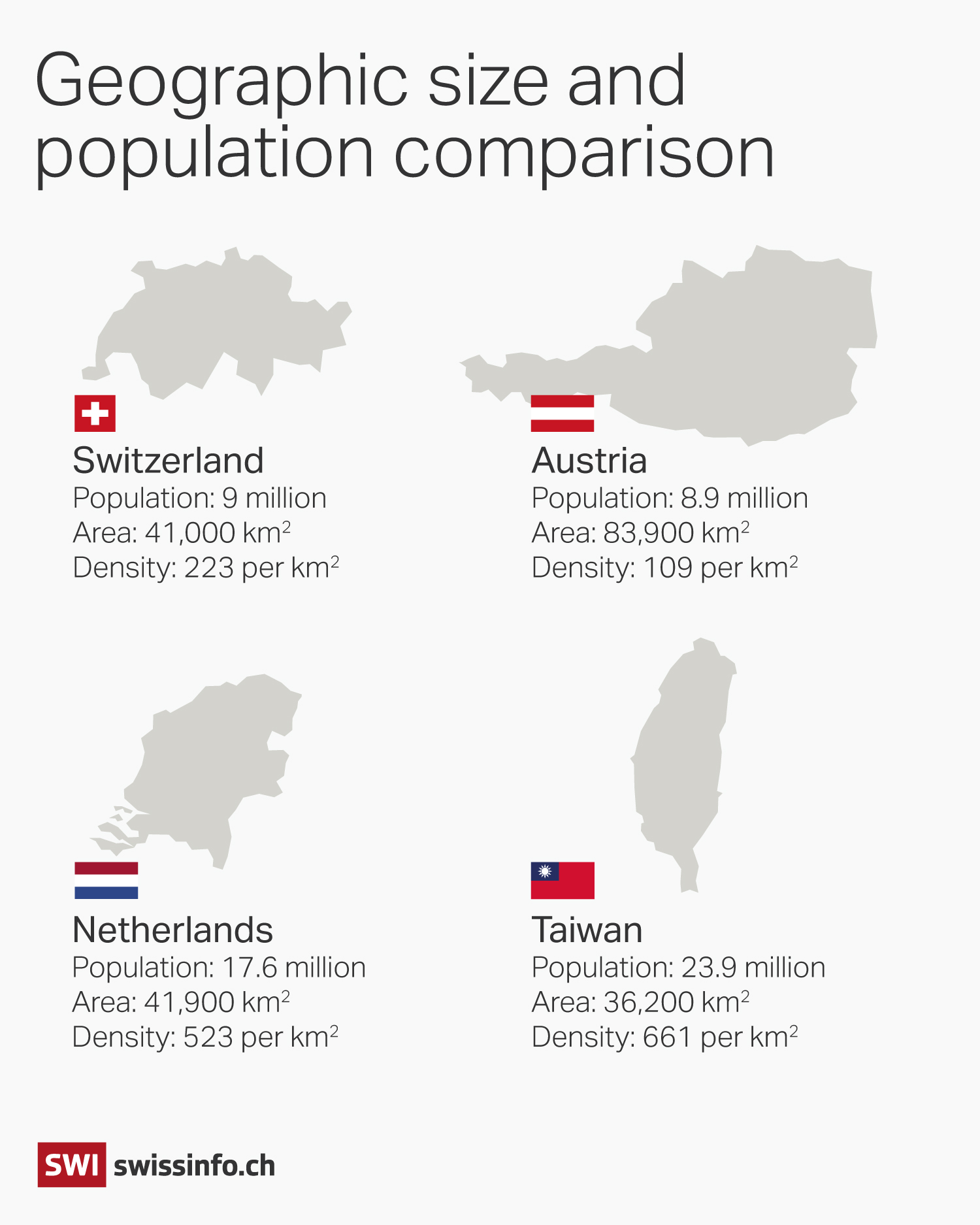 In a European comparison, the Netherlands, which has a land mass slightly smaller than that of Switzerland, has a current population of 17.9 million. Austria, however, is twice the geographic size of Switzerland but has a population of only 9.1 million. In Asia, Taiwan is roughly the same size as Switzerland but has a population of over 23.3 million.