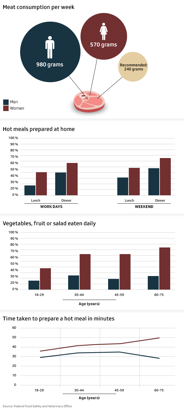 Meat makes the meal, according to a new Swiss survey that shows men eat four times the recommended amount and women consume more than double.