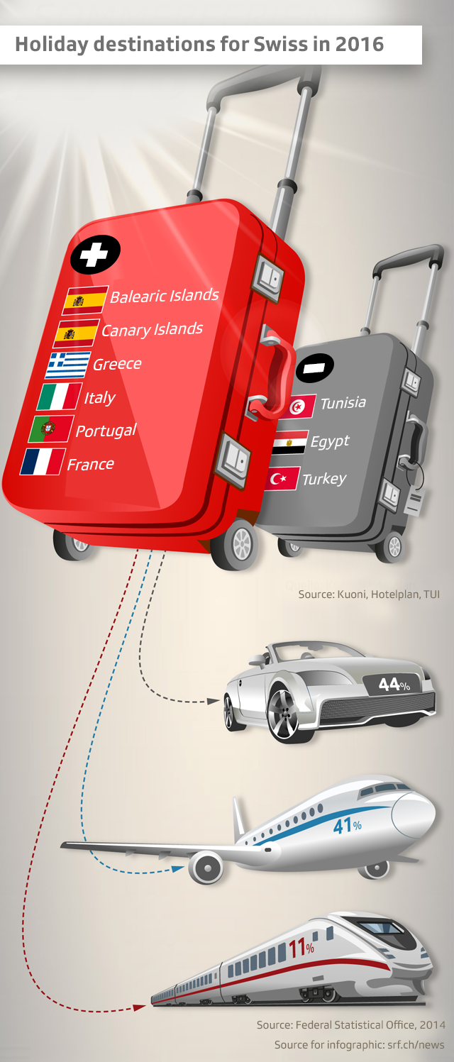 The figures show that Swiss travelled less to places where terrorism was having a negative effect on the tourism industry, such as Tunisia. Instead, they were heading for European destinations, notably the Iberian Peninsula.