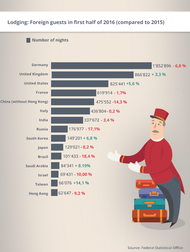 A 0.5% increase in overnights by Swiss guests (to 7.7 million) for the same period in 2015 has failed to make up for a 2.5% drop in those by foreign guests (9.1 million).