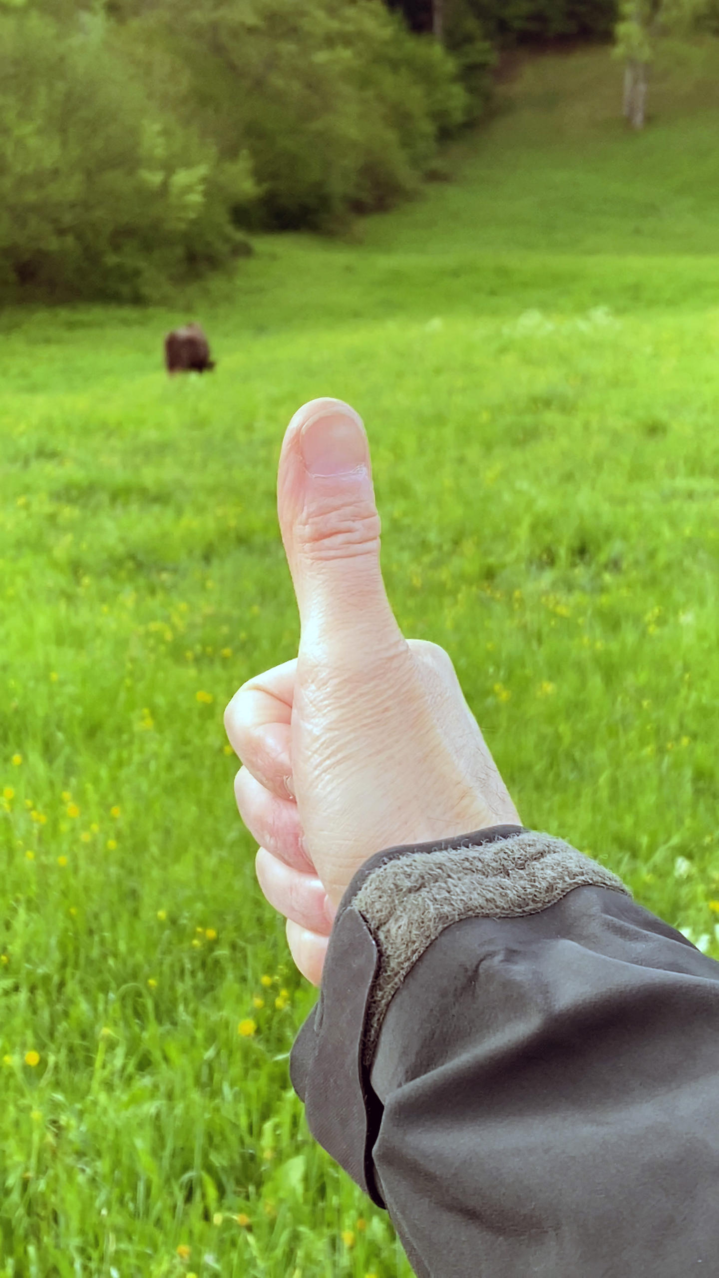 Otto Holzgang, a biologist, stretches one arm out and puts his thumb in front of a bison grazing on the slope above us. “If my thumb covers the whole animal, we are far enough away,” he says.