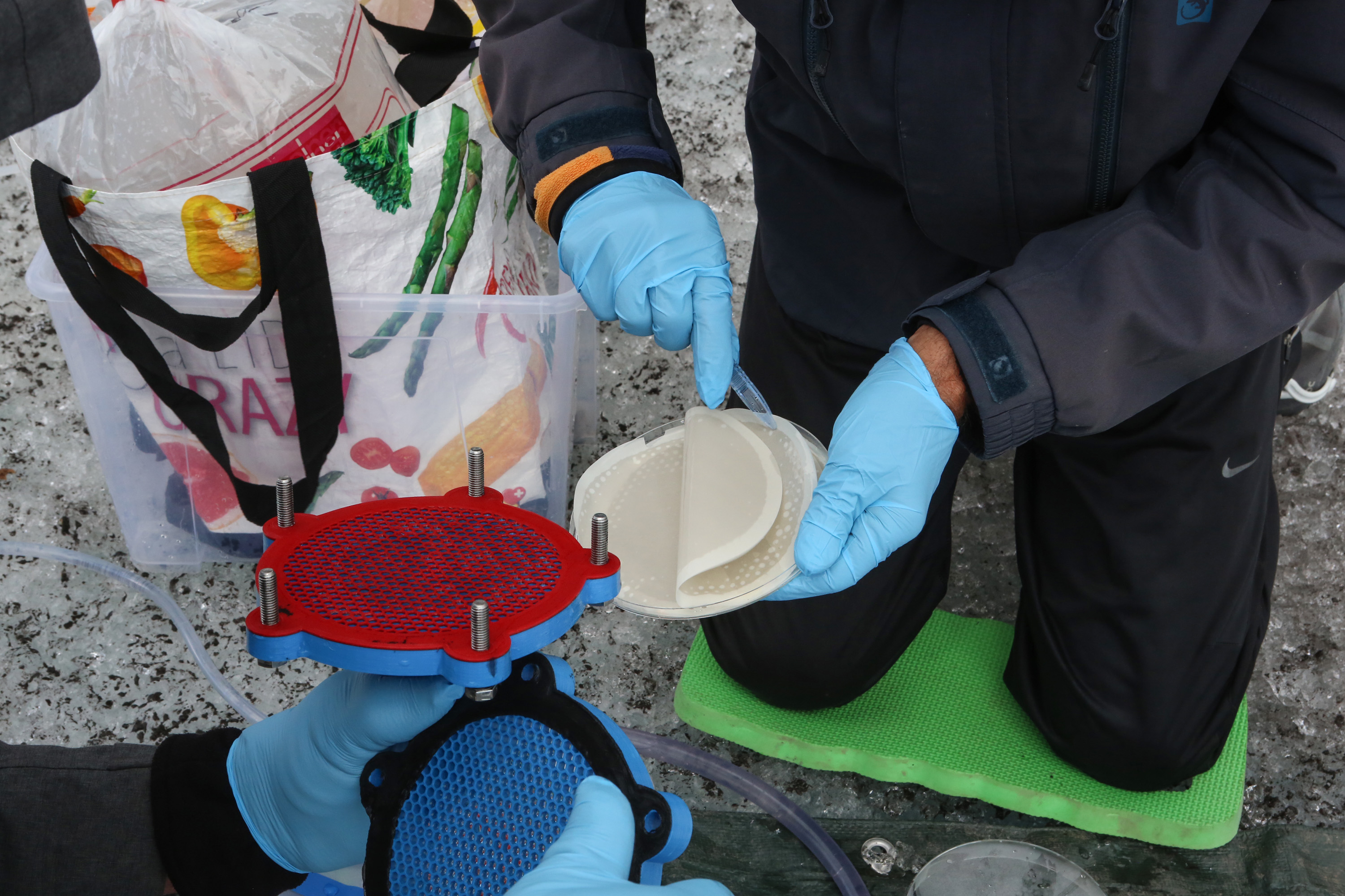 Filtering water directly on the glacier requires extra precautions such as wearing protective gloves to avoid contamination and keeping the filters in sterile containers.