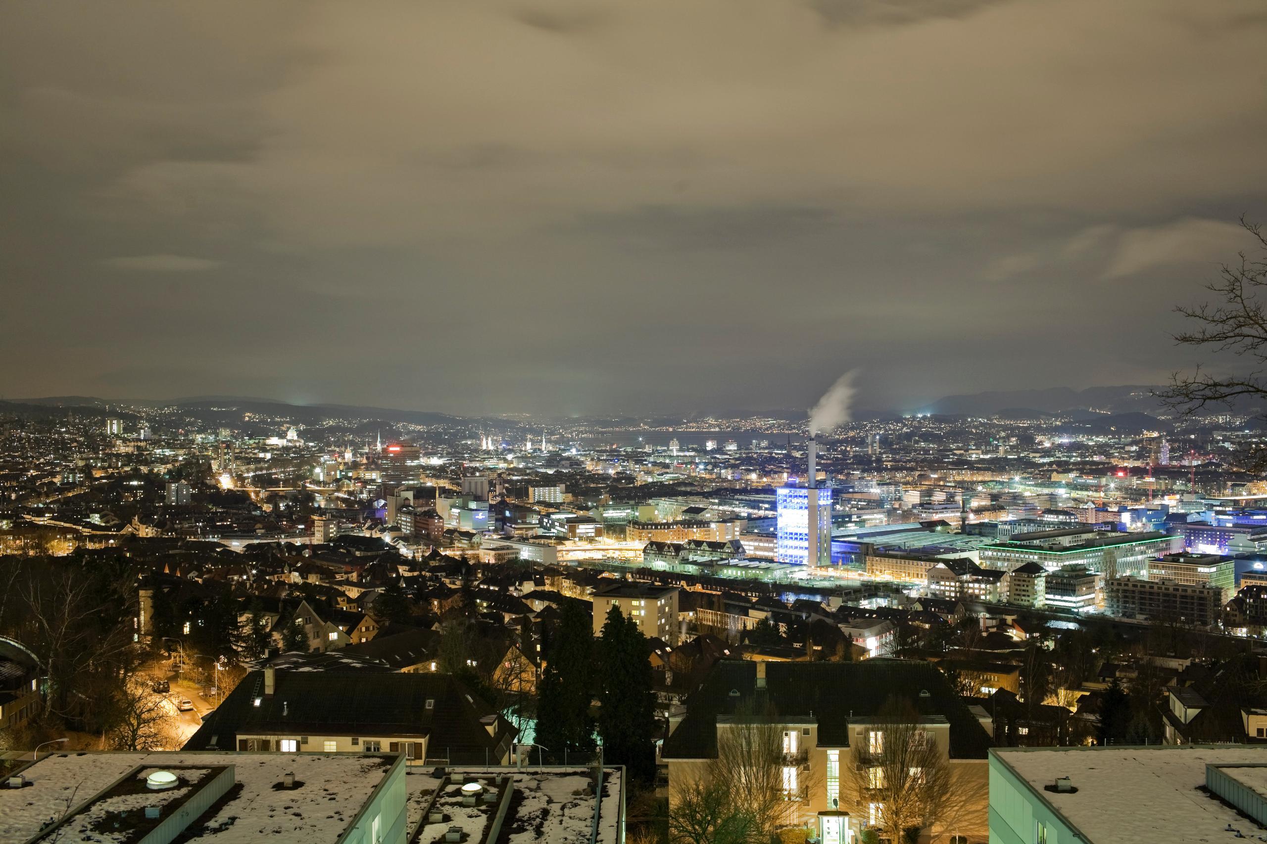 Skyglow from the city of Zurich lights up the sky over the village of Tagelswangen, April 2009