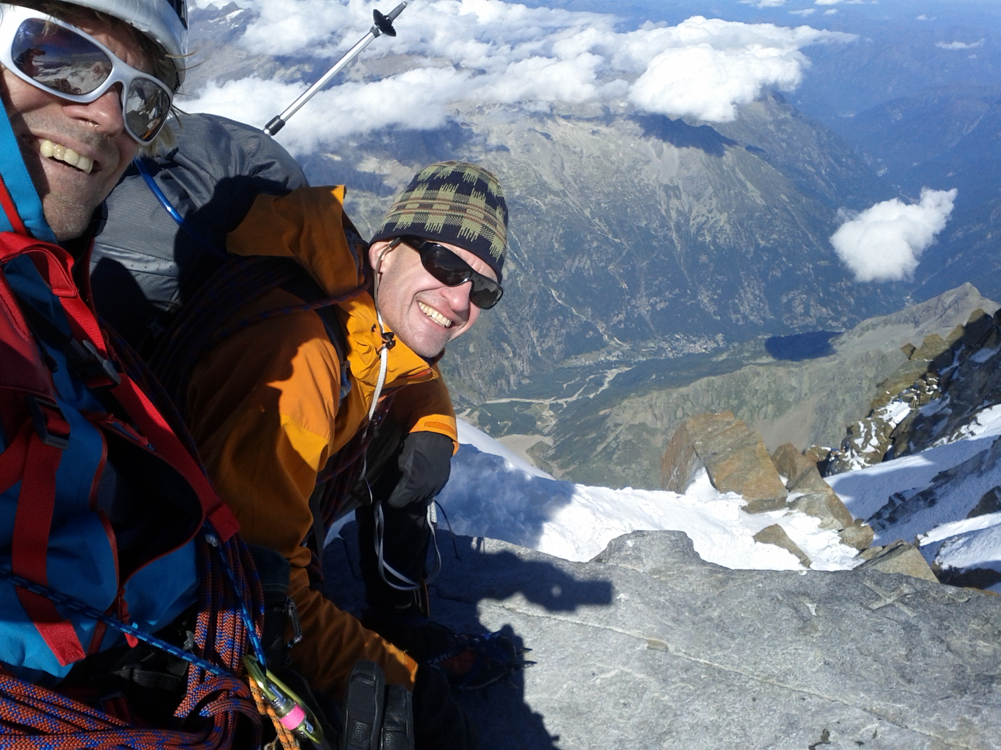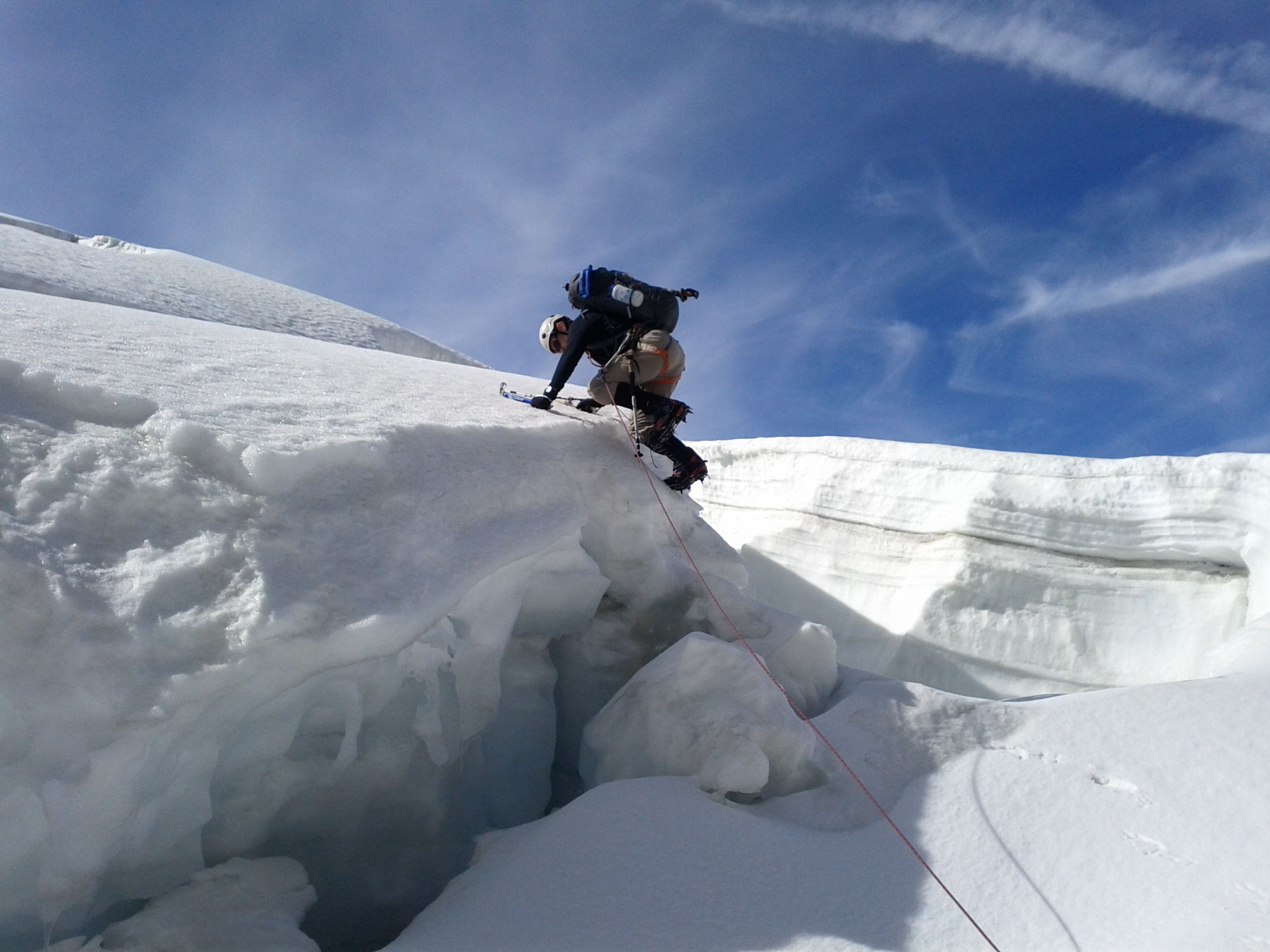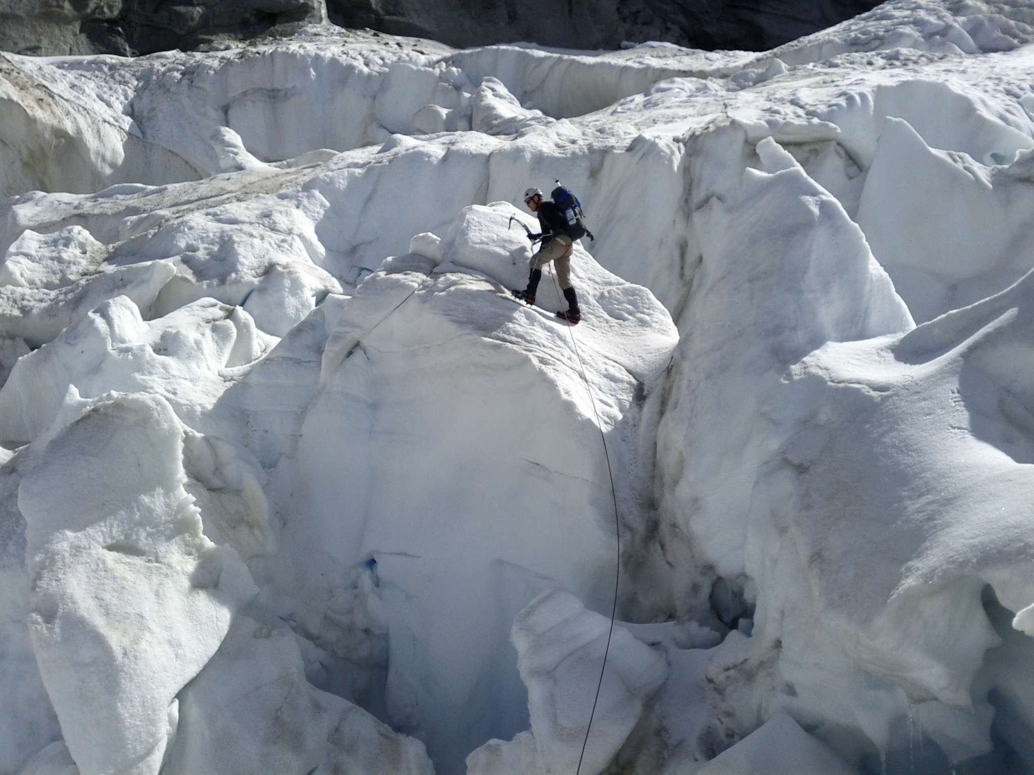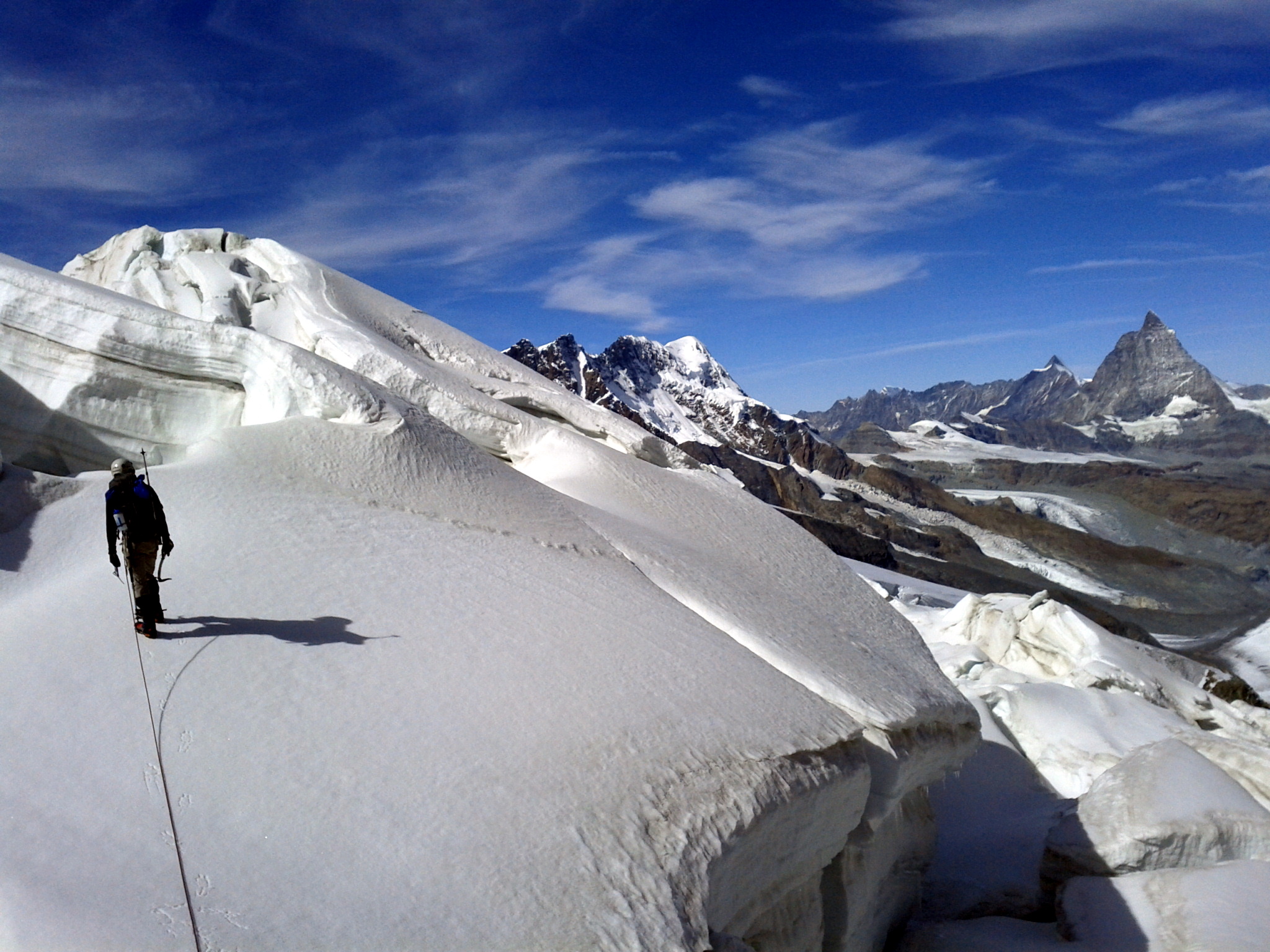 Getting here required some of the most entertaining mountain travel there is: navigating a maze of crevasses through an icefall. Where a glacier rolls over a steep bulge, it splits into crevasses, and the steeper the bulge generally the more the crevasses. They tend to link up, yielding numerous dead ends and/or interesting passages with snow or ice bridges and sometimes climbing down one side and up the other. We had a rope on for most of it, but only had to belay the trickiest passages, and only once resorted to placing ice screws for protection. This wasn’t the normal route, as we’d decided to shortcut the climb by not dropping all the way down to the Monte Rosa hut, much though I’d have loved to have seen it.