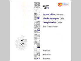 First-prize winners in the 1995 contest were bassoonist Laurent Lefèvre, cellist Claudio Bohorquez and guitarist Georgi Vassilev. This recording spotlights their interpretations on works by Françaix, Prokofiev and Brouwer.