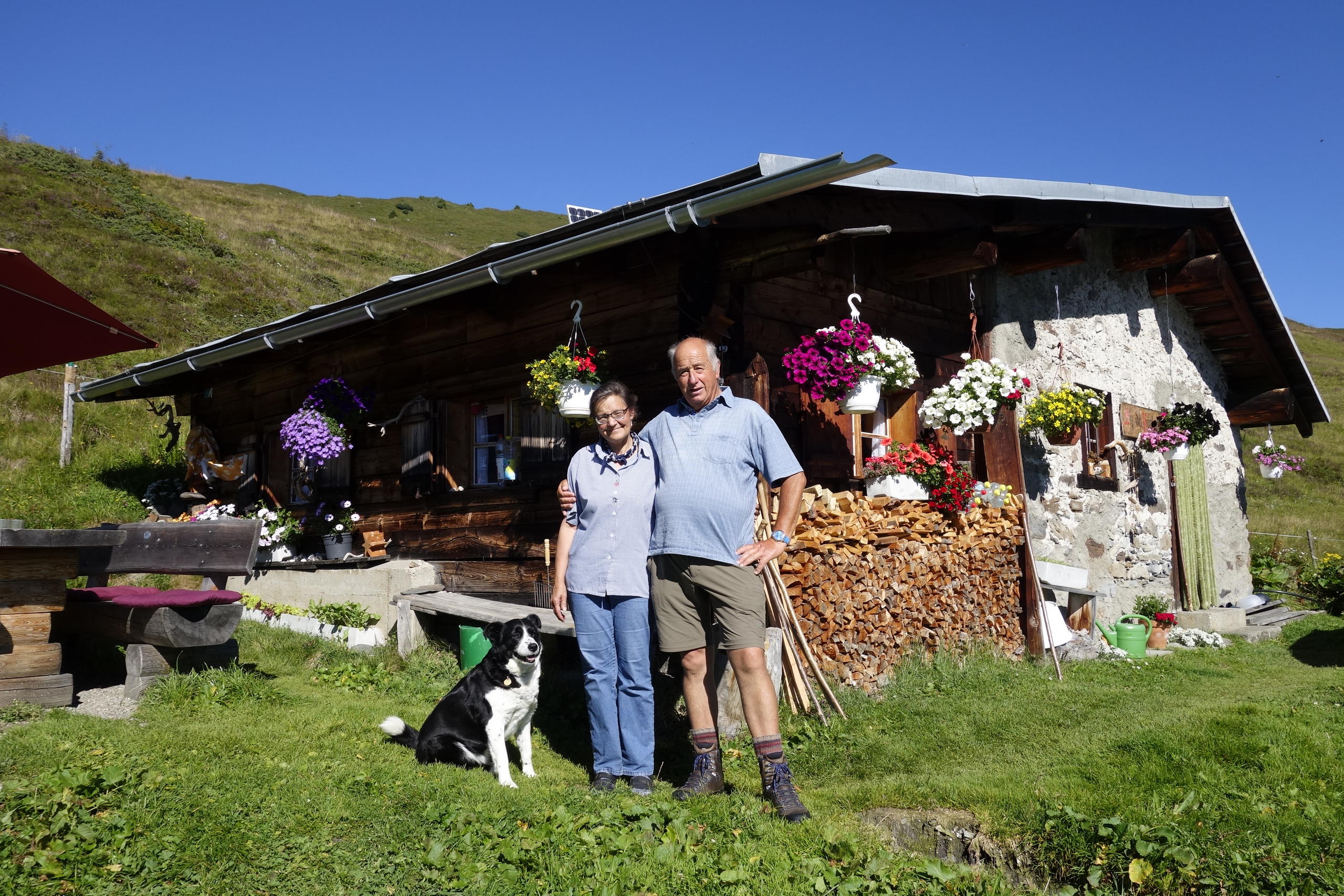 A jolly, suntanned man, Hänny surely makes friends easily. After I snap a few photos of him with his wife Vreni and their dog Gin, he’s eager to get me in the picture, too. He proudly shows off the flowers decorating the hut, including Edelweiss – urging me to pluck a few as a souvenir.
