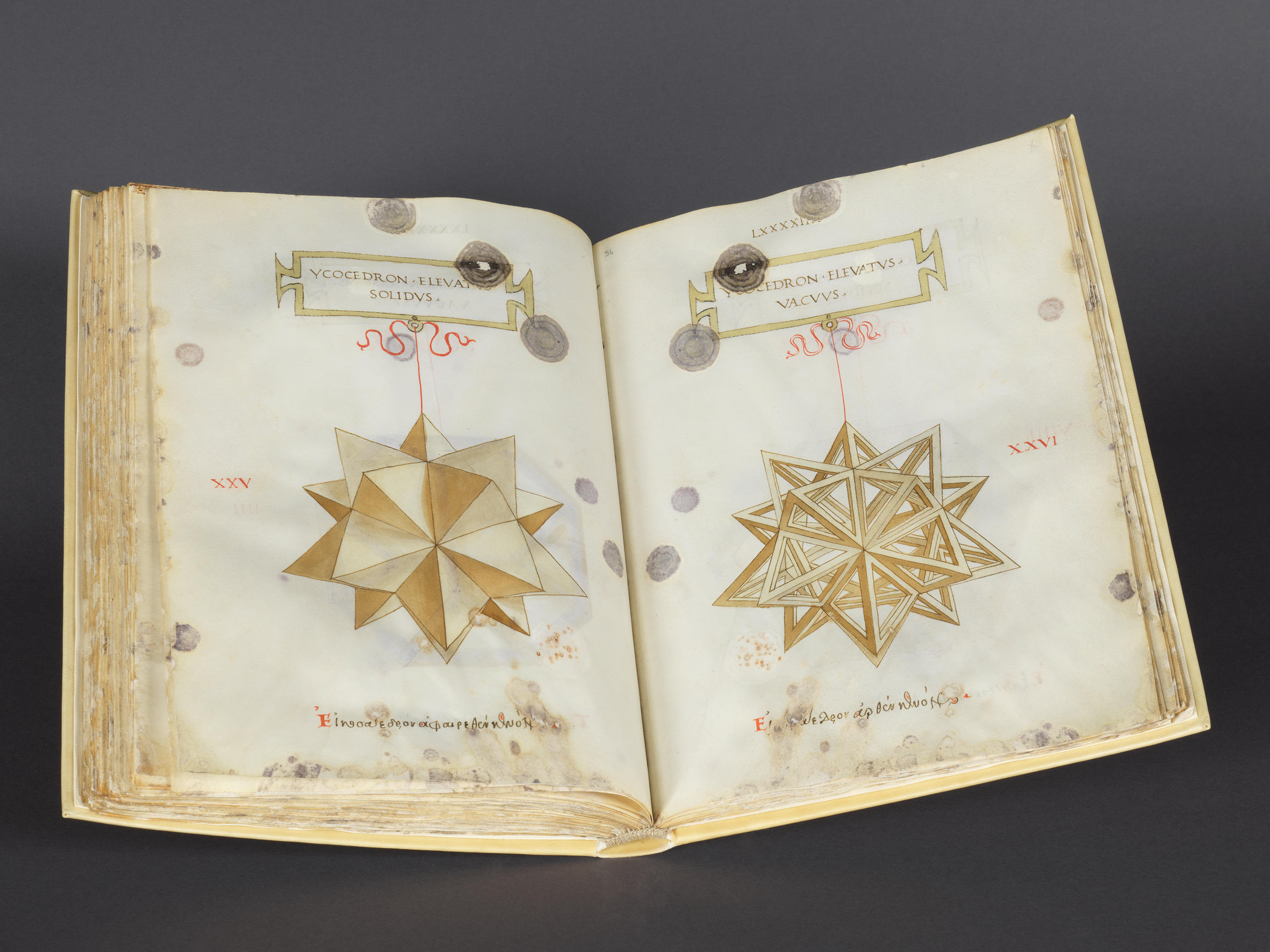 On March 1-2, the Geneva Library welcomes the public for a unique viewing of De Divina Proportione, a treatise on mathematics written by Luca Pacioli, a Franciscan monk and mathematician. Dated 1498, the manuscript includes 60 geometric figures on full pages that Pacioli attributed to da Vinci. Pacioli and da Vinci met and became friends in Milan in 1496 while Pacioli was teaching mathematics.
