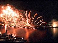 Over 30,000 spectators gathered on the shores of Lake Lucerne to watch a boat travel down from the blazing Pilatus mountain, spitting flames and fireworks as it journeyed to the Lucerne Cultural Centre.