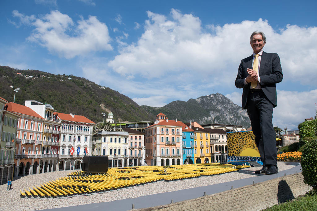 Marco Solari, president of the Locarno Film Festival, towers over a model of the Piazza Grande, complete with projection booth and screen – in reality the largest outdoor film screen in the world.