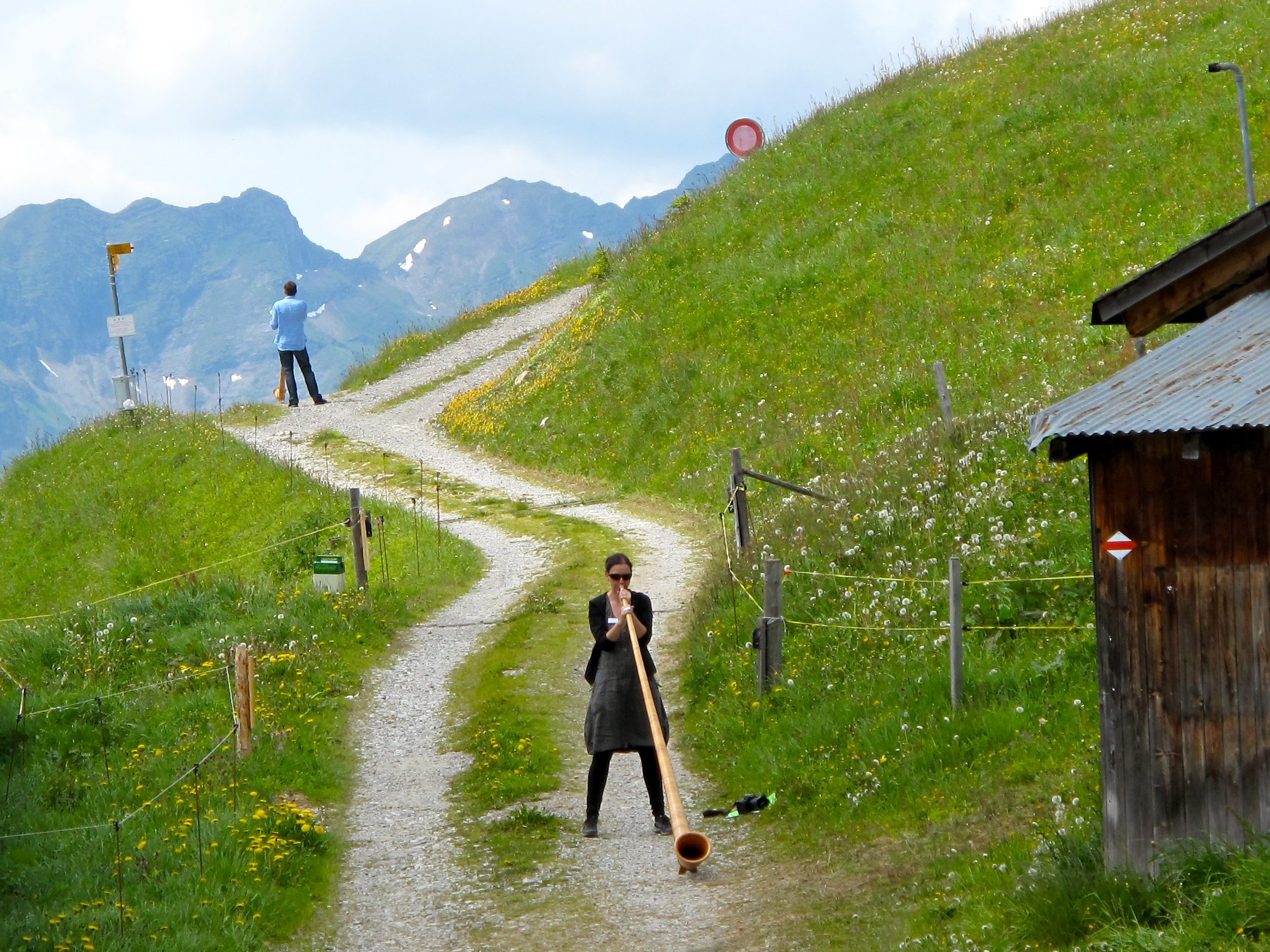 At 10am, 17 alphorn students – 16 Swiss and one American – are standing on the terrace of the Hotel Hornfluh, enjoying a drink before their hard work begins. They are here for Frautschi’s intensive weekend course, which means they’ll have up to four hours of instruction each day as well lectures on music theory and breathing technique.