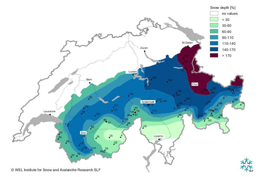This SLF chart below shows the depth of snow on January 10, as a percentage of the long-term averages.