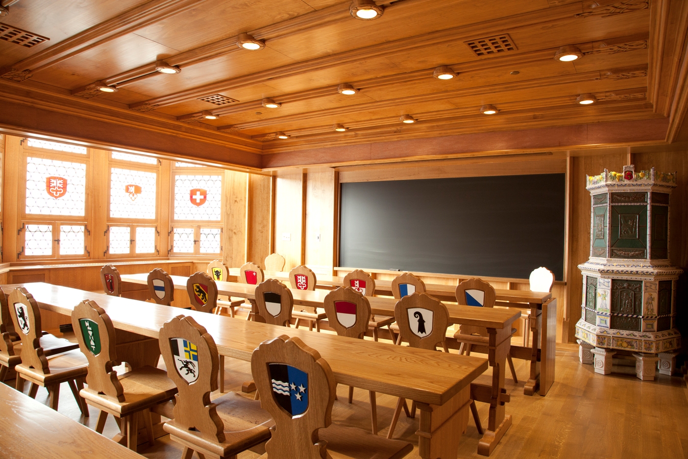 The Swiss room is modelled on the late 15th century “Zurich Room”, originally in the Fraumünster Convent, and now reconstructed in the Swiss National Museum in Zurich. The version in Pittsburgh includes a typical Swiss tiled stove, leaded glass windows, and carved wooden furniture. The 26 chairs each bear one of the coats of arms of the Swiss cantons, and the four tables represent the country’s four languages.