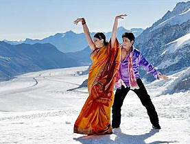 The song routines used to be shot in Kashmir, Indian mythology’s standard land of longing. But political unrest and border disputes with Pakistan have pretty well ruled out the Kashmir valley as a location. Switzerland, with its impeccable infrastructure and its mountains, has become the most popular substitute.